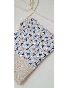 Funda de móvil combinada de tela estampada azul marino con tela beige tipo loneta cierre de cremallera en la parte superior  cordón de algodón color crema tamaño 12x19cm