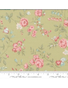 ela Avidey – Moda Fabrics Tela de algodón con fondo verde mint y delicado estampado floral en tonos rosa y coral. Perfecta para patchwork y costura creativa.