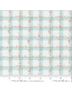 Tela Abide Light Blue – Moda Fabrics Algodón con fondo claro, cuadros en verde mint y detalles florales en rosa.