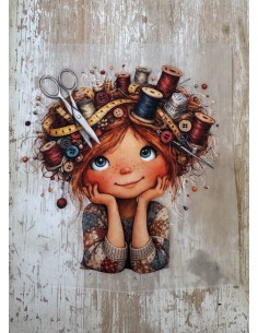 Transfer textil DTF con ilustración artística y encantadora de una niña pelirroja con una espectacular corona formada por carretes de hilo, botones, tijeras, cintas métricas y elementos de costura. Un diseño que representa la creatividad sin límites, la imaginación artesanal y el amor por el mundo handmade. Ideal para personalizar: – camisetas – bolsos...