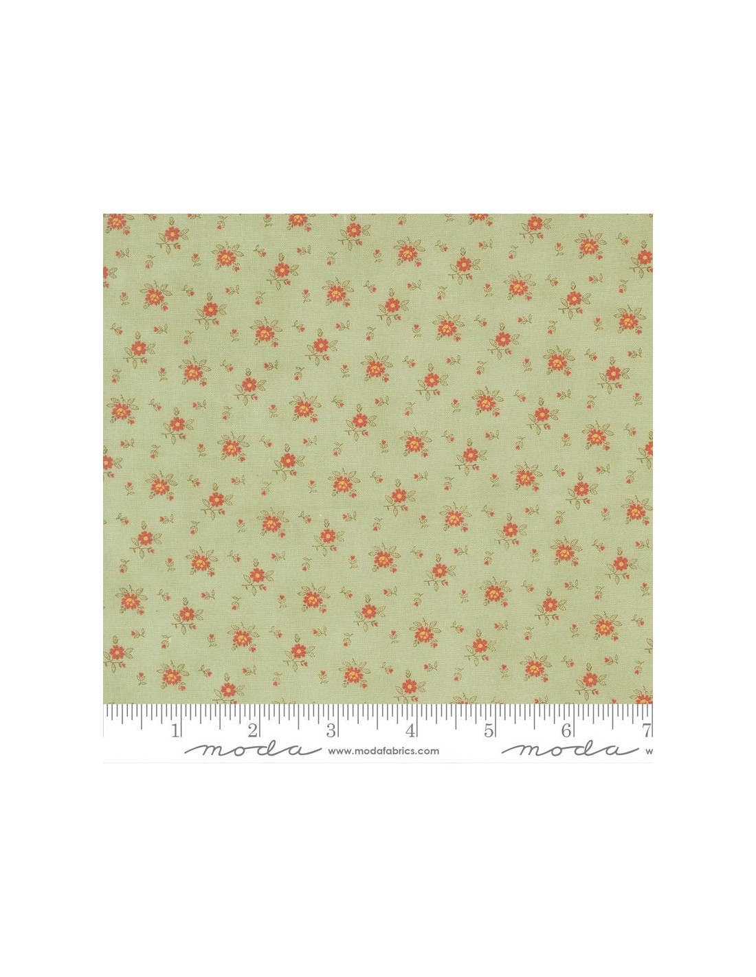 Una tela suave y delicada de la colección Ambiance, diseñada por 3 Sisters. Presenta un estampado de pequeñas florecitas en tonos coral y amarillo, acompañadas de hojitas finas en verde oliva sobre un fondo verde suave. Su diseño es sutil, equilibrado y perfecto para aportar un toque romántico, clásico y muy femenino a tus proyectos.