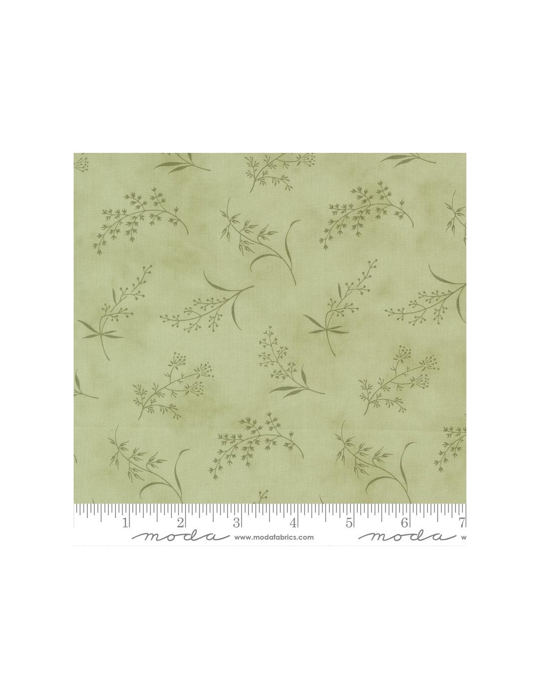 Una tela elegante y serena de la colección Ambiance, diseñada por 3 Sisters. Presenta un delicado estampado de ramitas y hojas finas en tonos verde oliva sobre un fondo verde suave y ligeramente difuminado. Su diseño sutil y natural aporta calma, equilibrio y un aire clásico perfecto para combinar con estampados florales más pronunciados de la misma colección.
