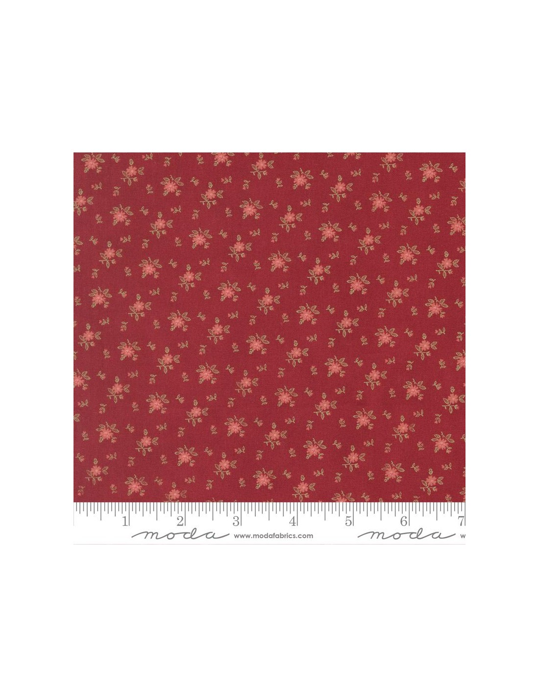 Una tela delicada y tradicional de la colección Ambiance, diseñada por 3 Sisters. Presenta un estampado de pequeñas flores en tonos rosa suave y coral, acompañadas de hojitas en verde oliva sobre un fondo rojo profundo. Su diseño fino, equilibrado y muy elegante aporta un estilo romántico y cálido, perfecto para proyectos con aire vintage.