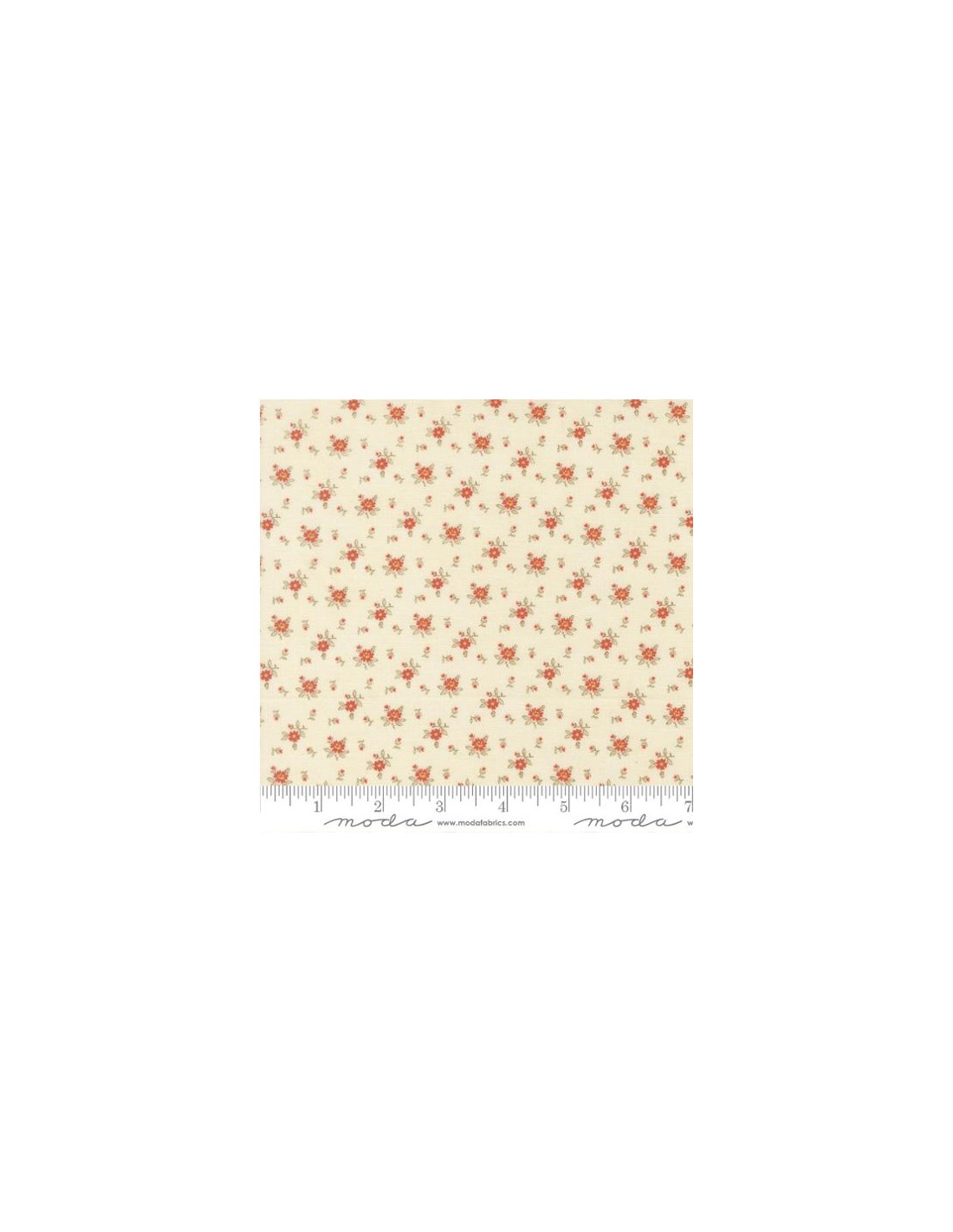 Una tela suave y delicada de la colección Ambiance, diseñada por 3 Sisters. Presenta un estampado de pequeñas florecitas en tonos coral, rosa y amarillo suave, acompañadas de diminutas hojas en verde oliva, todo sobre un fondo porcelana claro y cálido. Su diseño es sutil, armonioso y perfecto para aportar un toque romántico y vintage a cualquier proyecto.