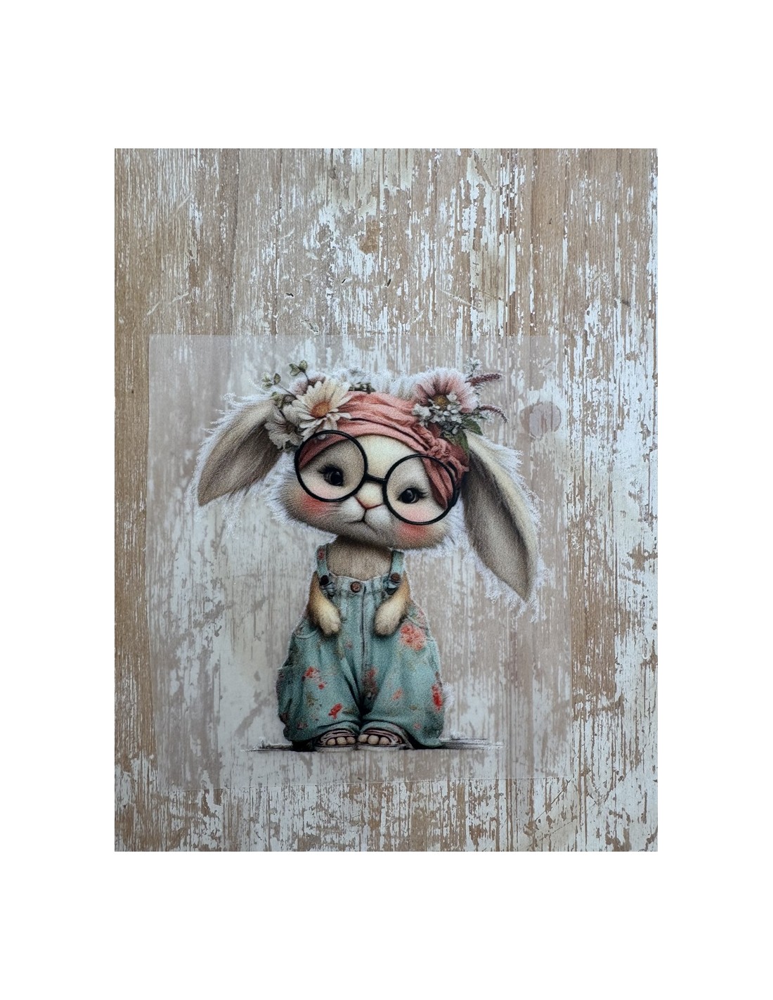 Transfer DTF de alta calidad con ilustración de conejita estilo vintage con gafas redondas y turbante floral.