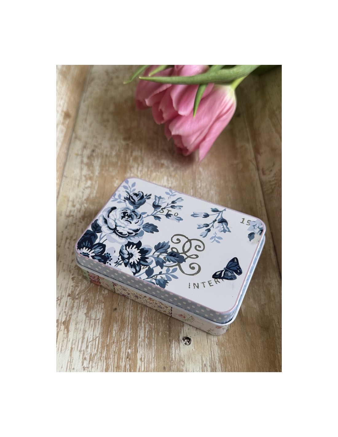Caja metálica decorativa con delicado estampado floral en tonos azules, ideal para guardar pequeños tesoros, hilos, botones, joyas, recuerdos especiales o material de costura. Su tamaño compacto la hace perfecta para tener a mano en el taller, el escritorio o la mesilla.