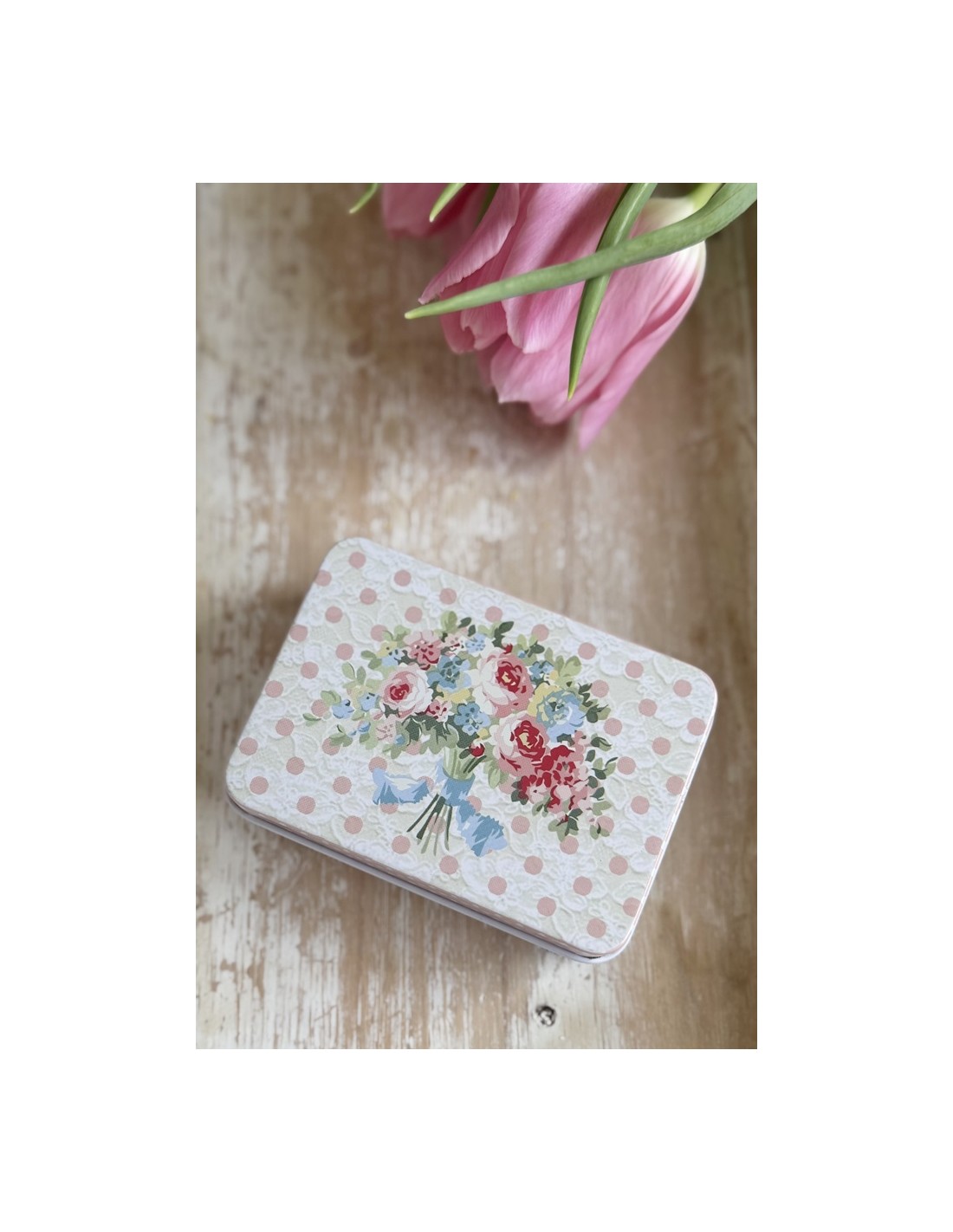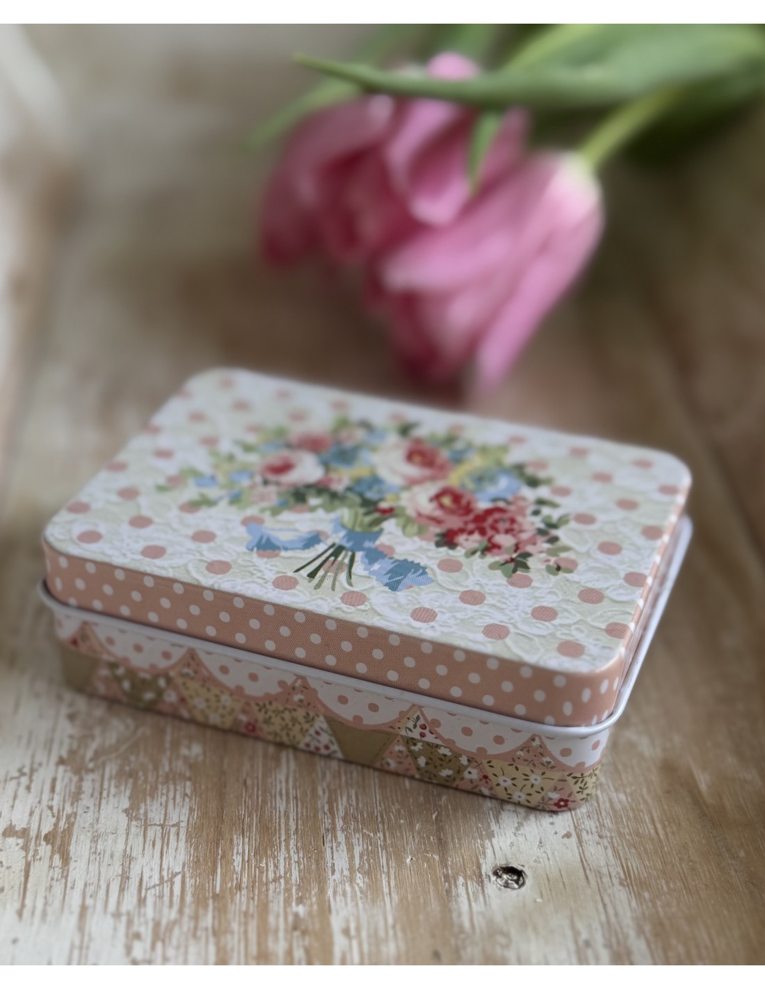 Caja metálica decorativa con delicado estampado de ramo floral en tonos rosa, azul y verde, sobre fondo claro con lunares y efecto encaje. Ideal para guardar joyas, pequeños recuerdos, botones, hilos o material creativo.