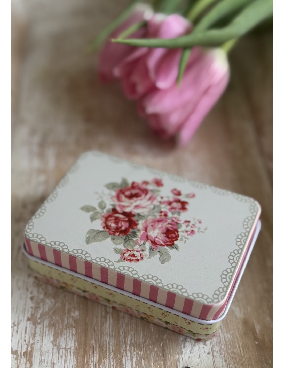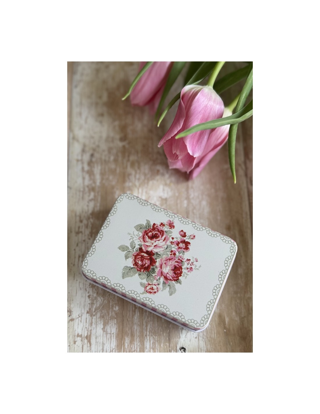 Caja metálica decorativa con elegante estampado de rosas en tonos rosados y burdeos, sobre fondo claro con delicado borde ornamental. Ideal para guardar joyas, pequeños recuerdos, botones, hilos o material creativo.
