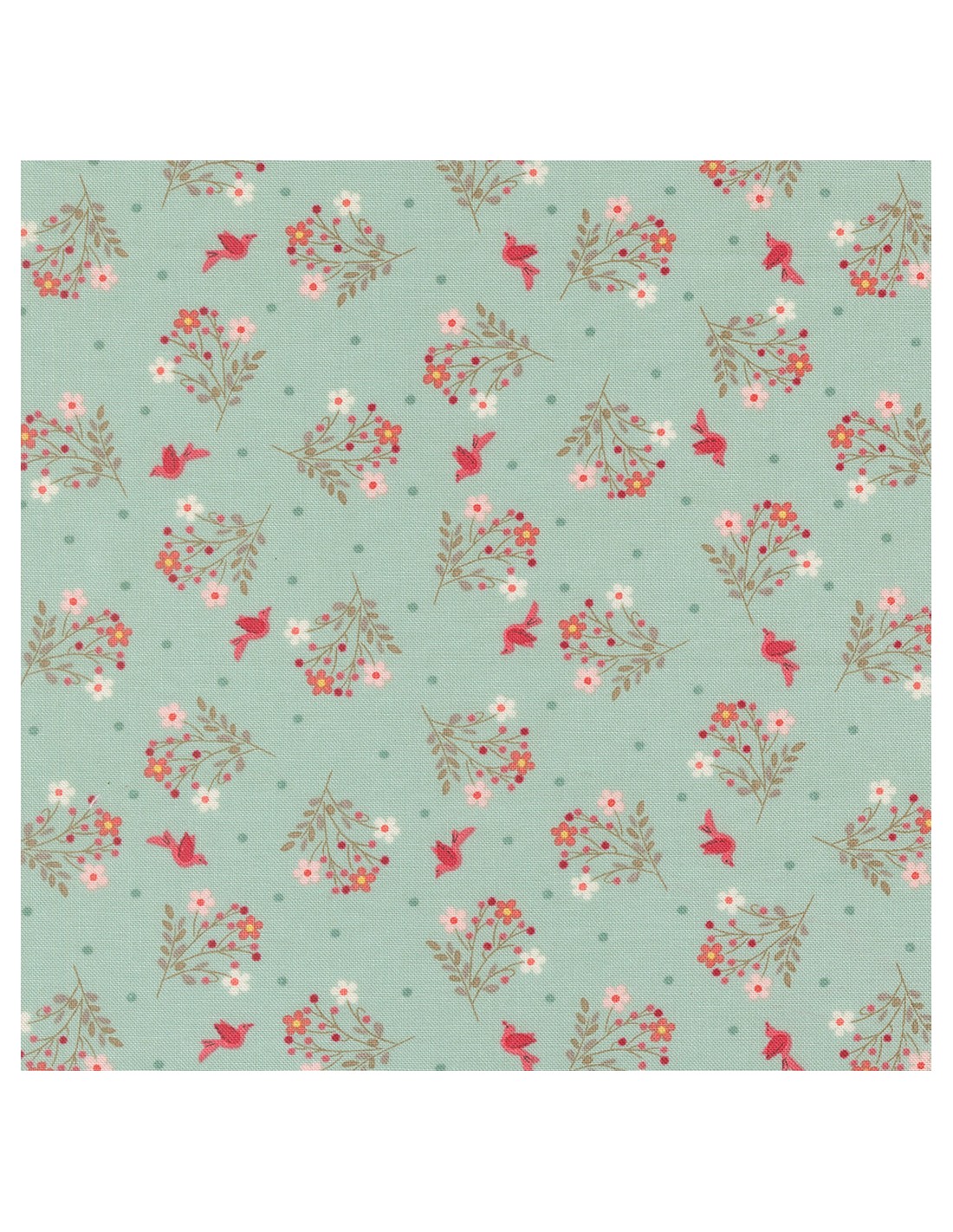 El estampado Wild Flowers Sky presenta ramitas florales en tonos rosa, coral y amarillo suave, acompañadas de pequeños pajaritos en rojo frambuesa, sobre un fondo verde menta claro (sky) con diminutos lunares sutiles.