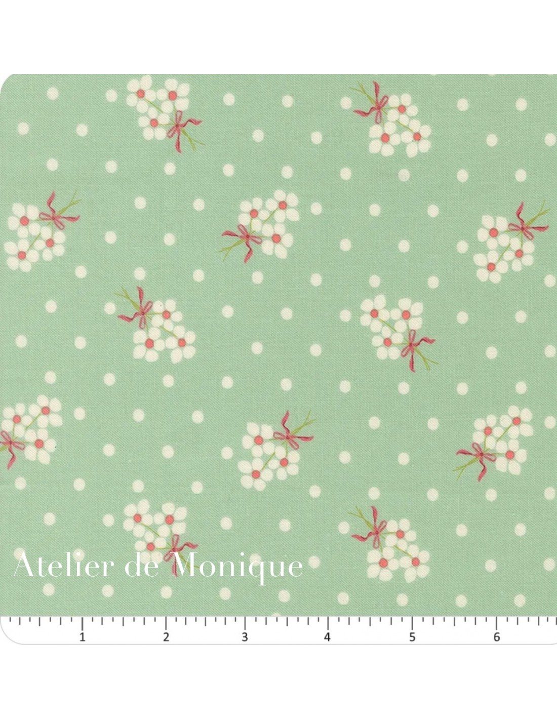El estampado Sky Bouquets presenta pequeños ramilletes de flores blancas con centro coral, atados con un delicado lazo rosa, distribuidos sobre un fondo verde menta claro con lunares blancos.