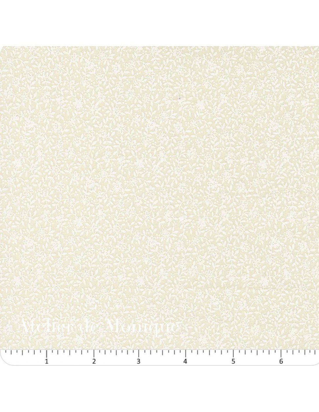 El estampado Porcelain White Wild presenta un delicado dibujo floral en tono blanco marfil sobre un fondo porcelana beige muy suave. Un diseño sutil y refinado que aporta textura sin sobrecargar, perfecto como fondo en quilts o como tela coordinada para combinar con los florales principales y los tonos verde menta de la colección.