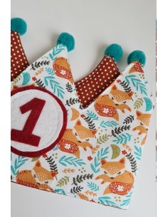 Corona de cumpleaños reversible formada por: *Tela exterior tela algodón 100% fondo en color blanco y estampado de zorritos durmiendo *Tela interior en color cobre y lunares
