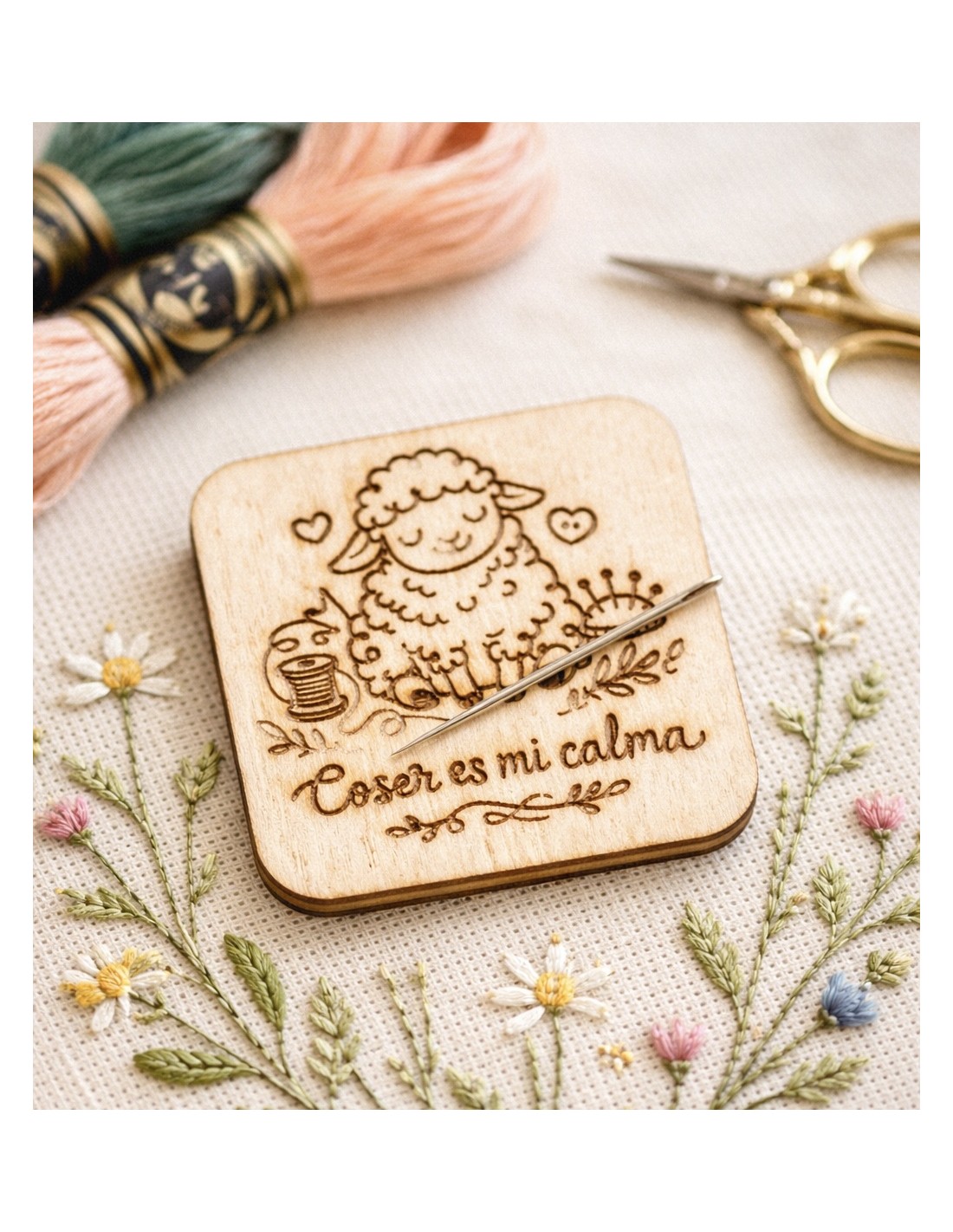 Práctico minder o cuidador de agujas de madera grabada con un dulce diseño de ovejita y la frase “Coser es mi calma”.