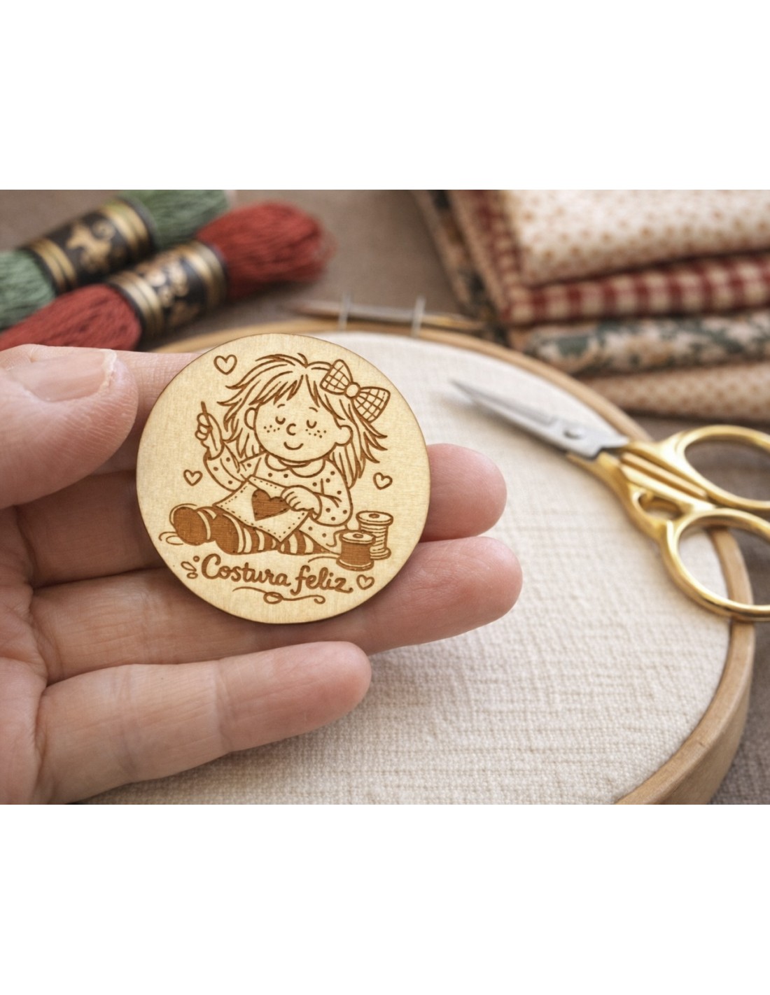 Bonito minder o cuidador de agujas de madera grabado con una dulce ilustración de una niña cosiendo y la frase “Costura feliz”. Un pequeño accesorio pensado para acompañarte en tus momentos de creatividad.