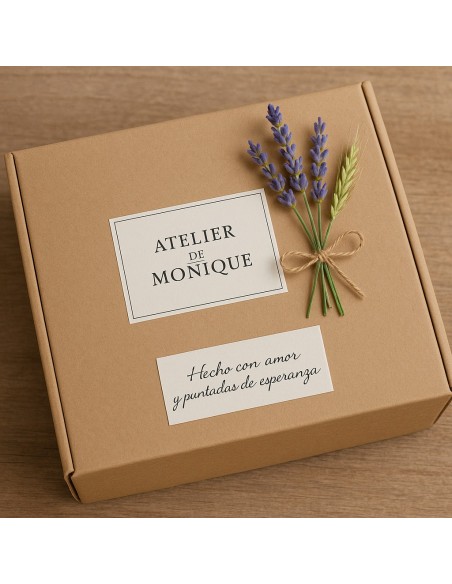 Todo cuidadosamente presentado, lleno de pequeños detalles que harán que al abrirla sientas esa chispa que solo da lo hecho a mano y con cariño.