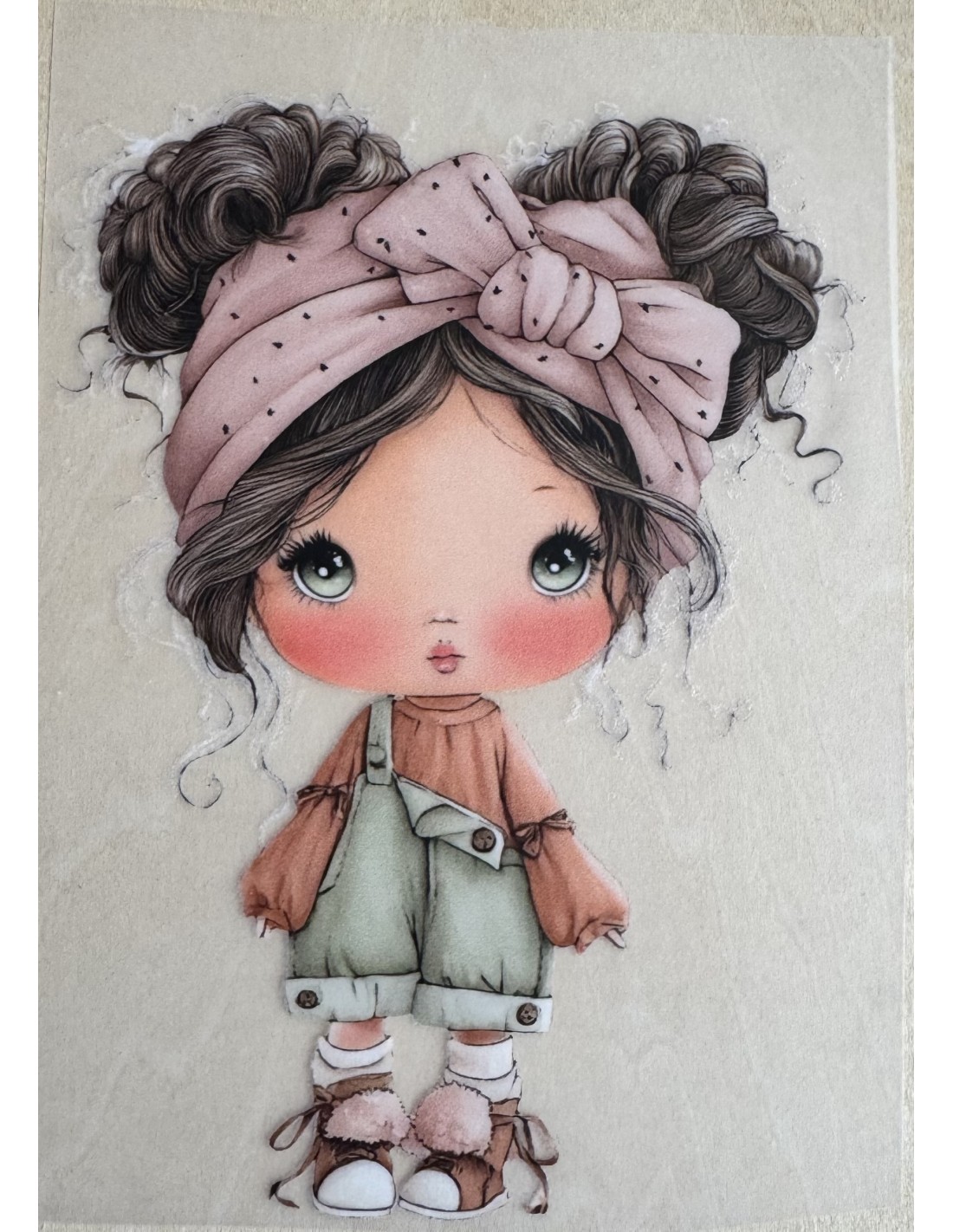 Este transfer textil DTF presenta una encantadora ilustración de muñequita de estilo delicado y romántico, con tonos suaves y detalles cuidados que aportan un toque único a cualquier prenda o proyecto creativo.