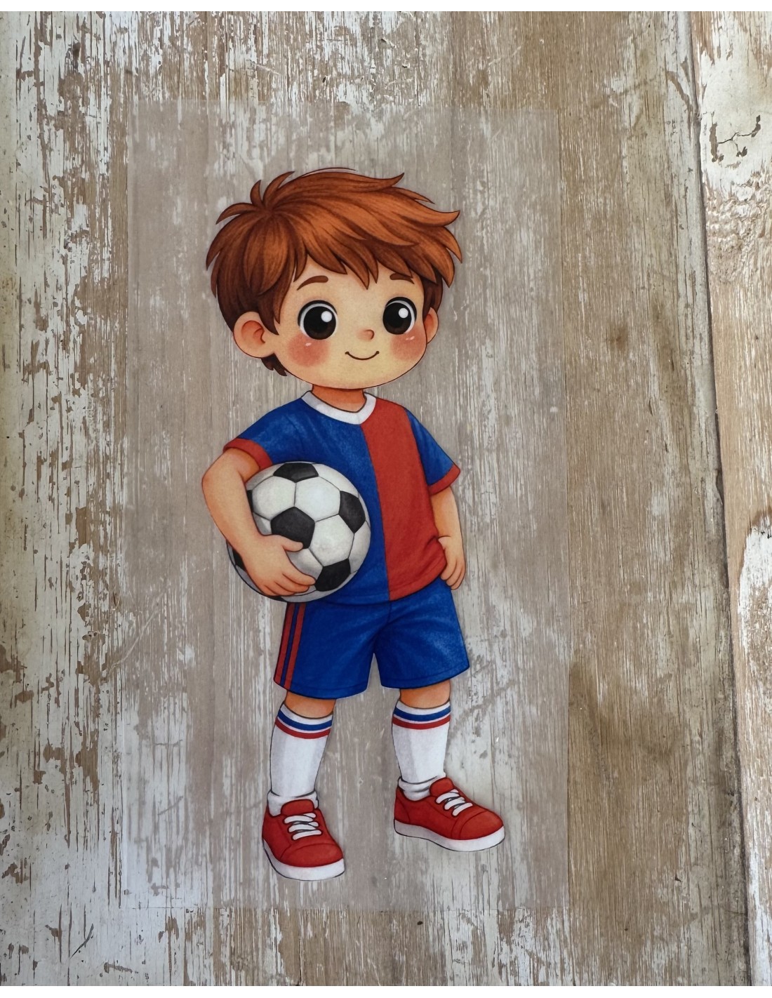 Transfer textil DTF con ilustración infantil de un simpático niño futbolista con uniforme clásico en tonos rojo y azul, sosteniendo su balón con actitud segura y alegre.