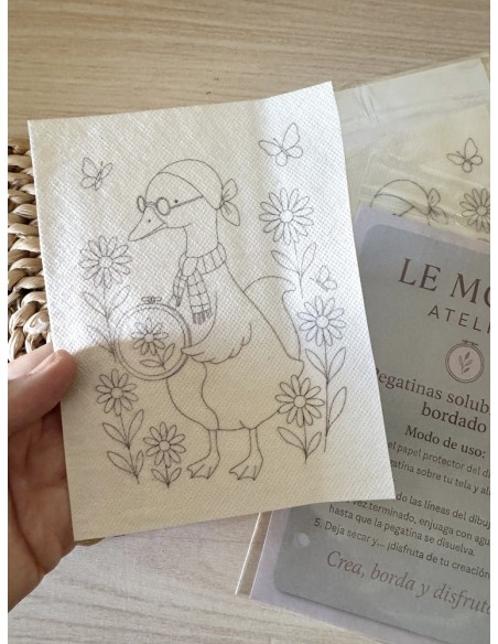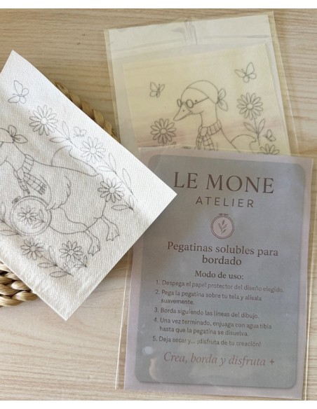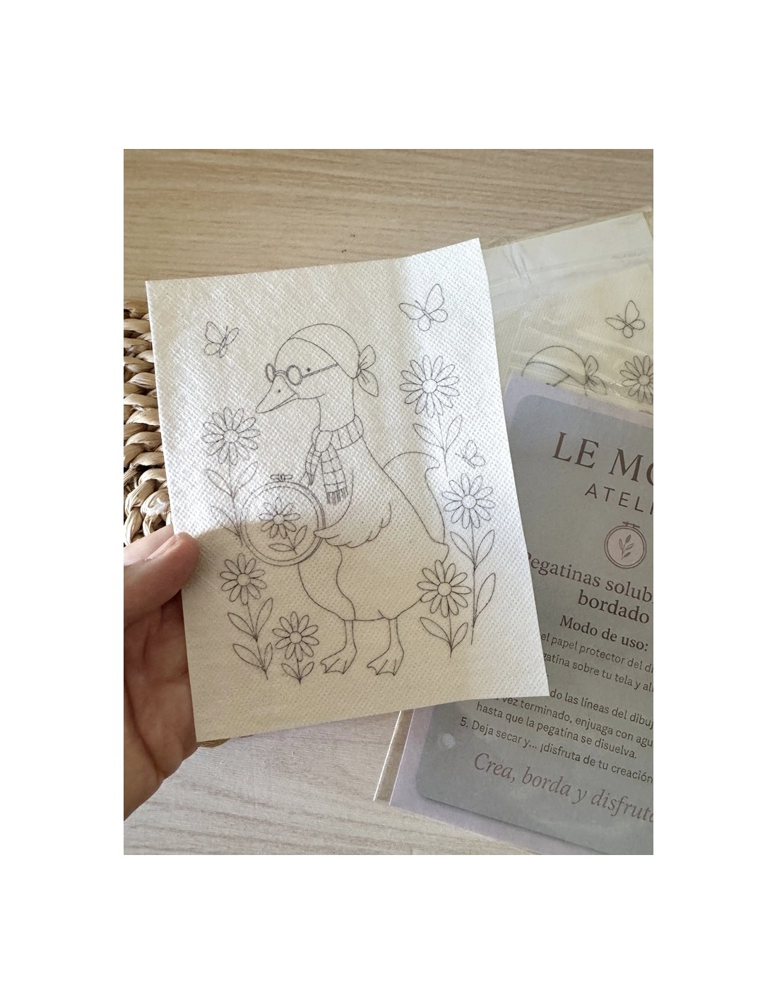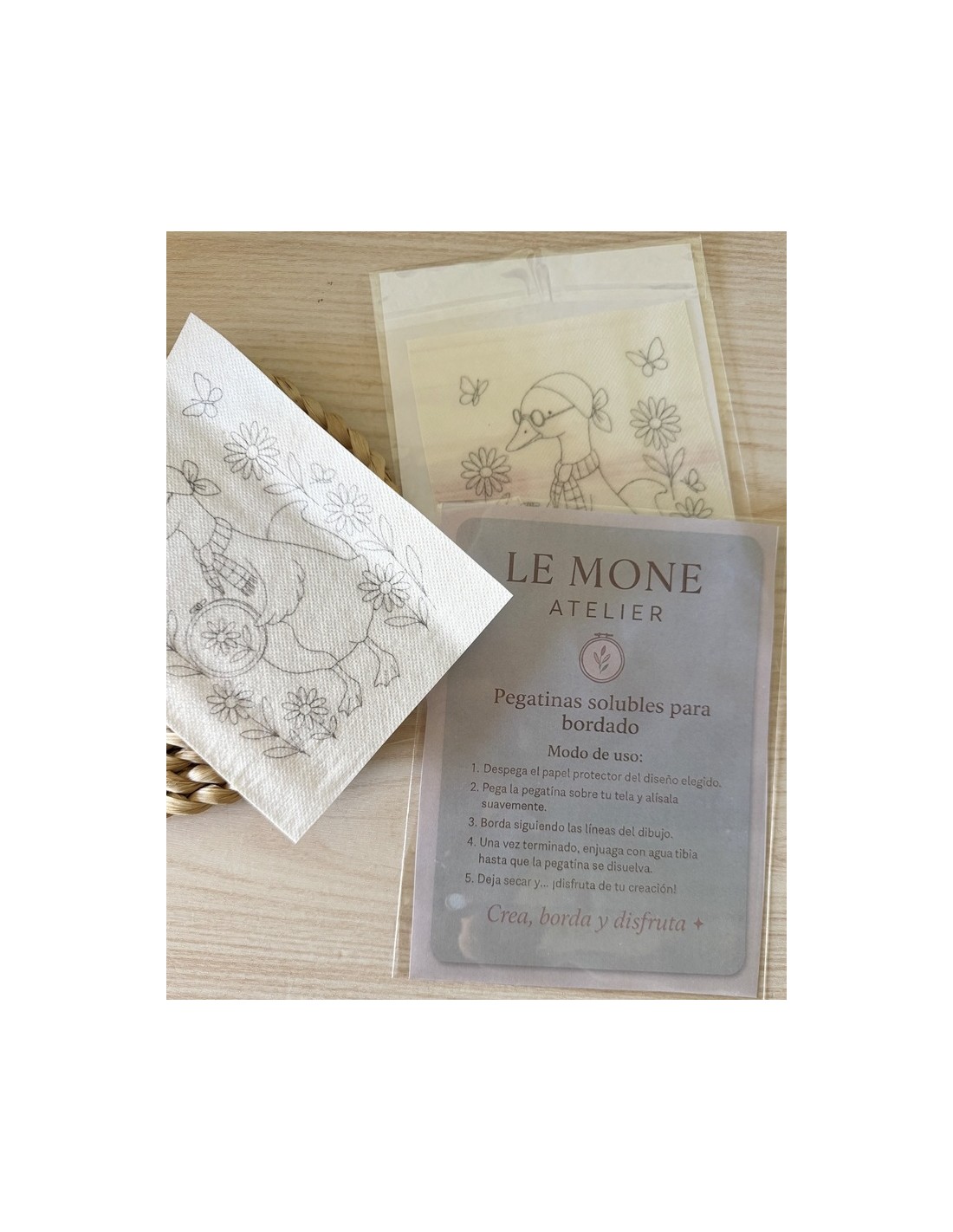 Pega la pegatina sobre tu tela, borda siguiendo las líneas y disuélvela fácilmente en agua para revelar un bordado lleno de dulzura.