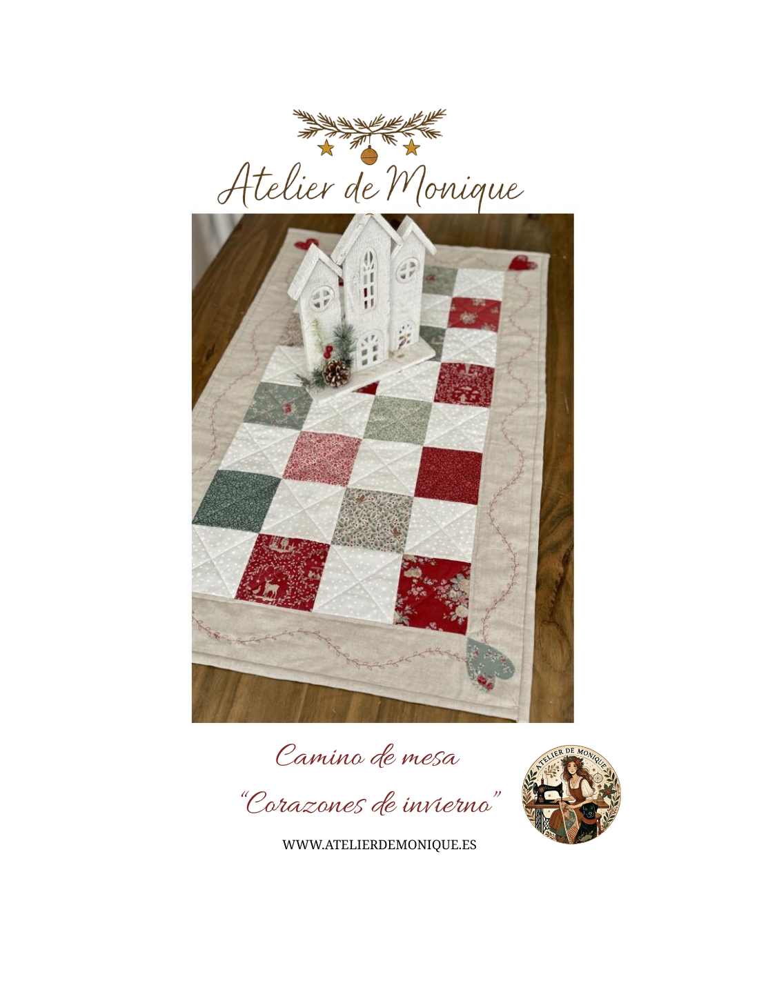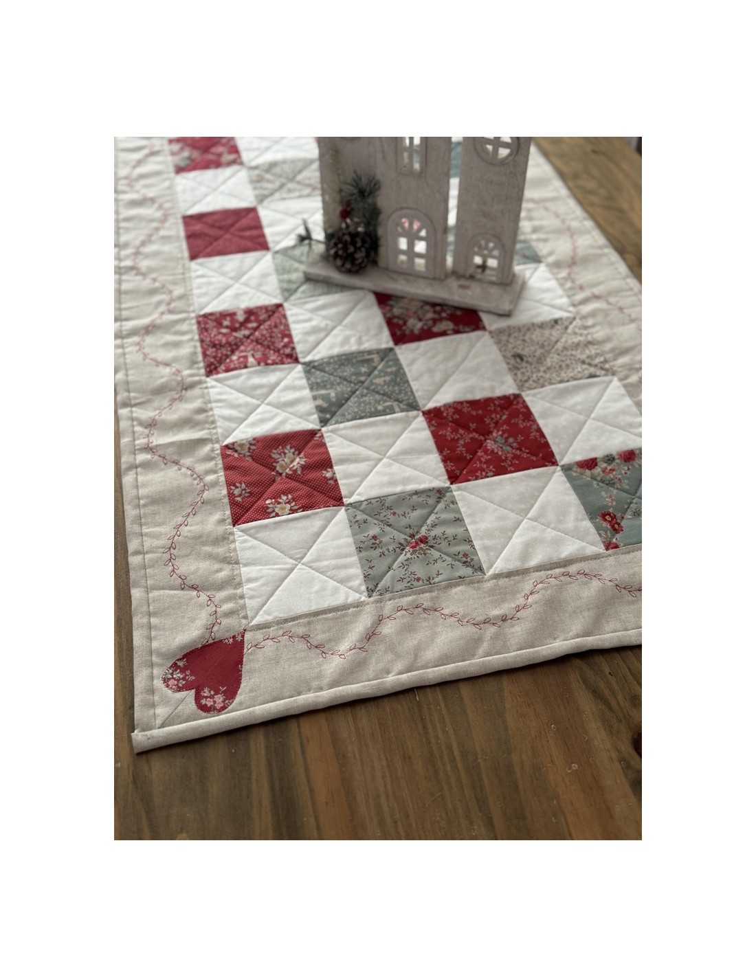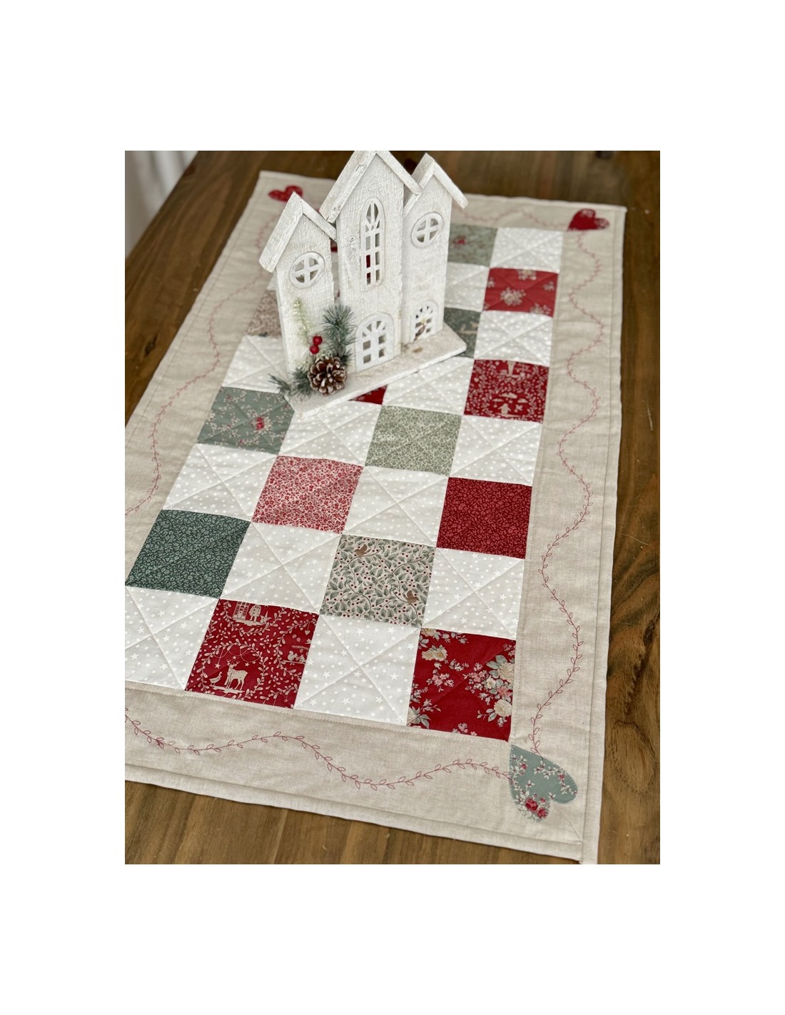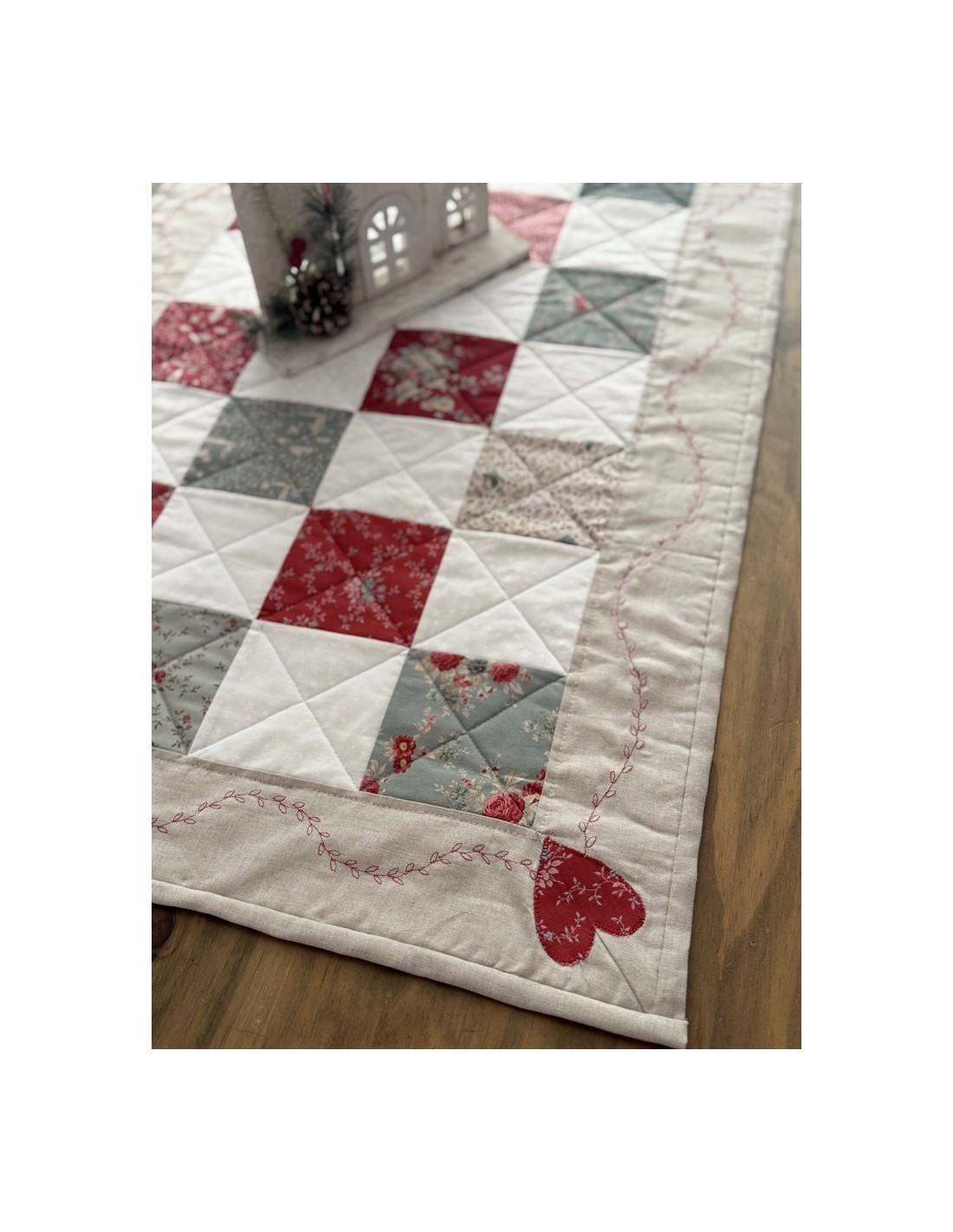 Este delicado camino de mesa combina tonos suaves de rojo, gris verdoso y lino natural, creando un diseño cálido y acogedor ideal para cualquier época del año, especialmente el invierno.