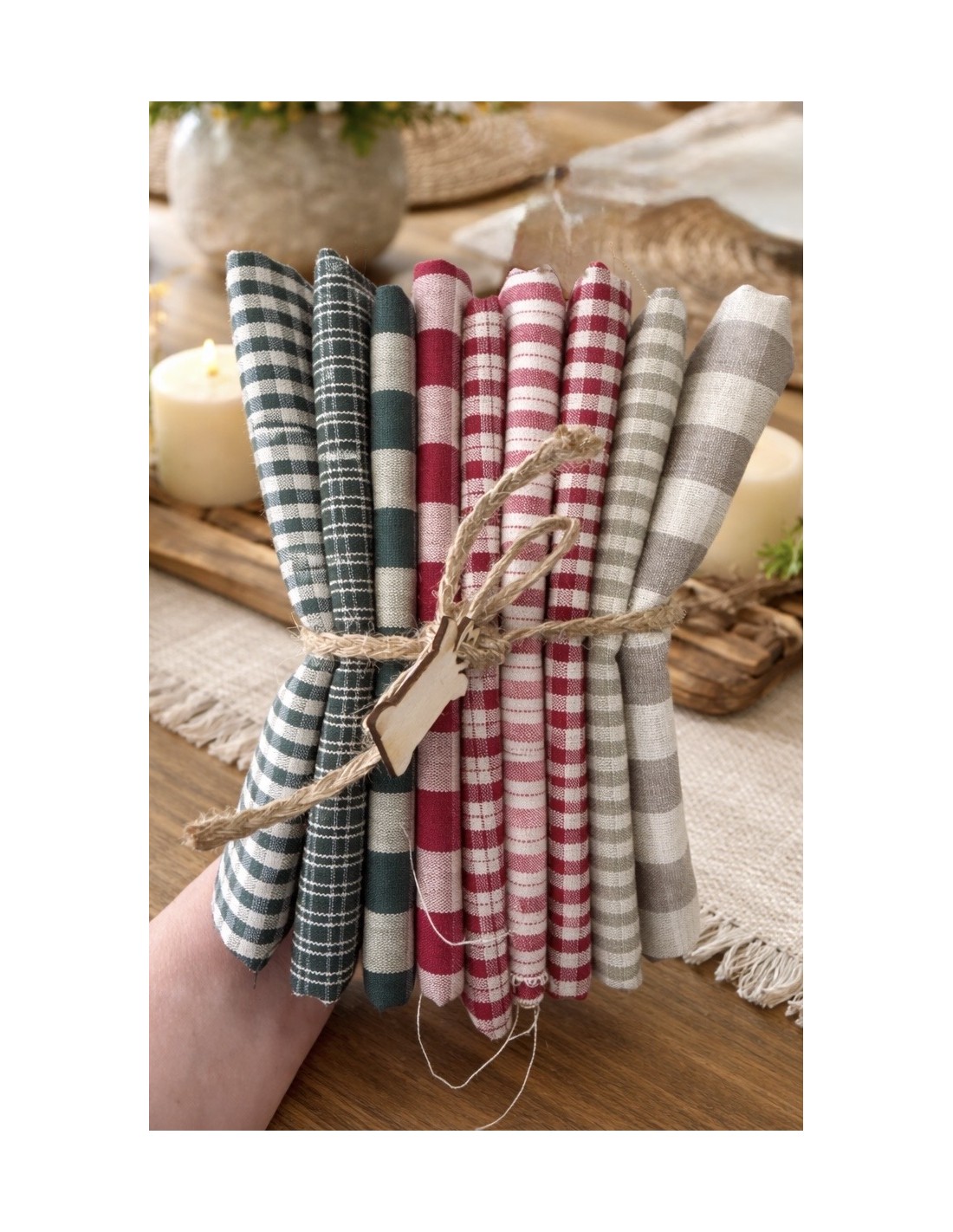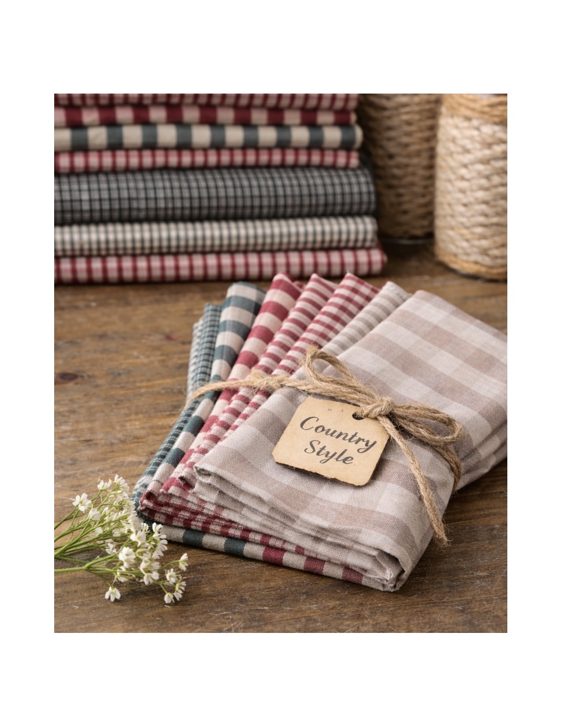 Pack de 8 telas estilo country en tonos cálidos y clásicos. Incluye una combinación de cuadros y vichy en tonos beige, rojo y verde, perfectas para patchwork, costura creativa y proyectos decorativos con aire rústico.