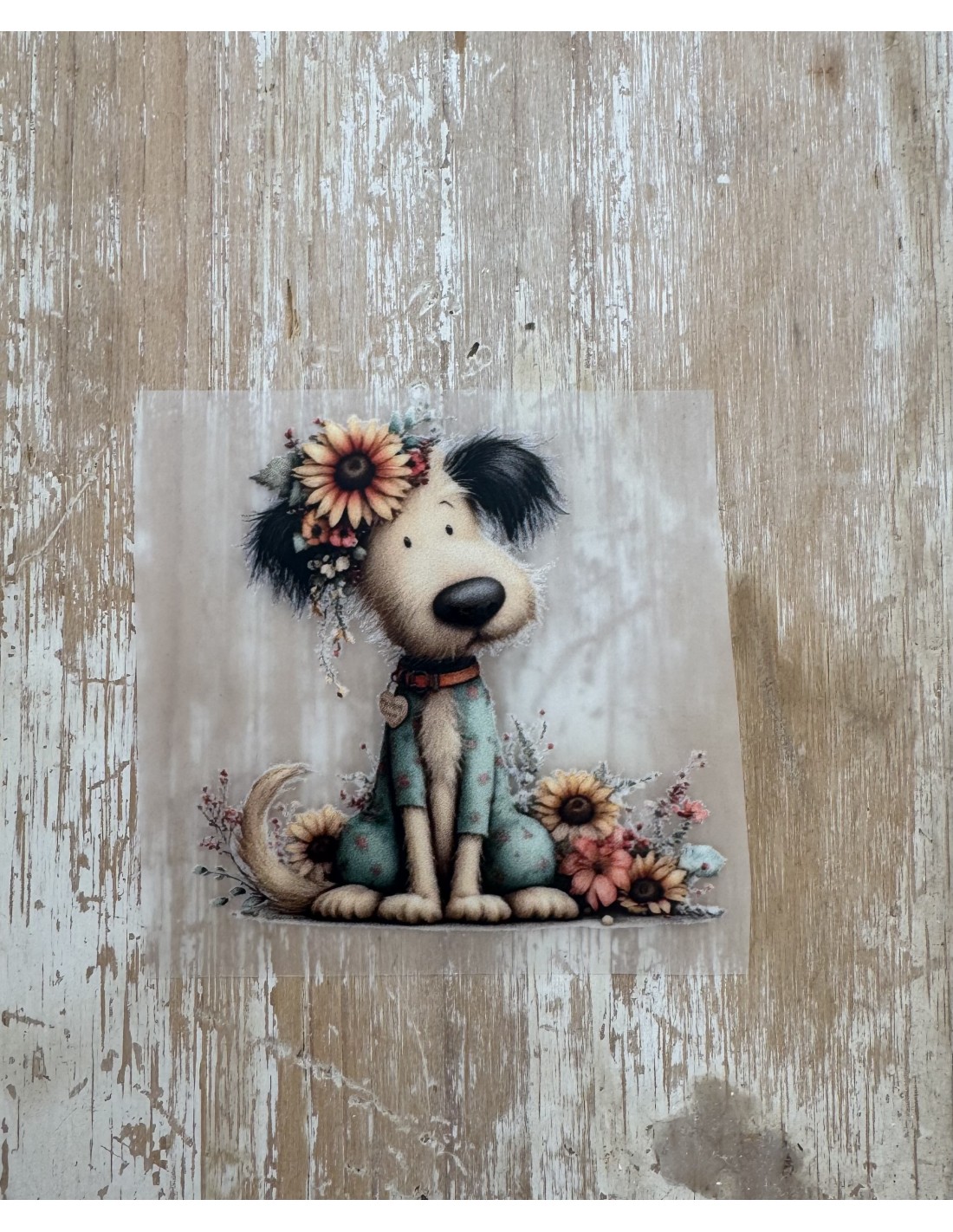 Transfer DTF de alta calidad con ilustración de perrito estilo vintage con detalle floral.