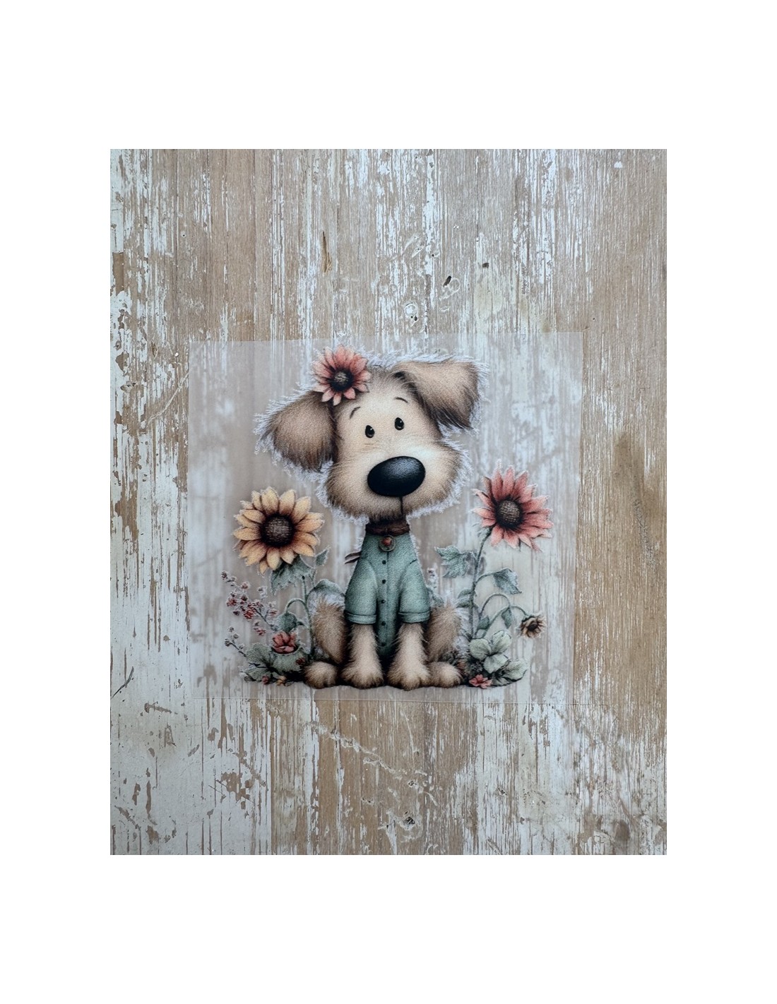 Transfer DTF de alta calidad con ilustración de perrito estilo vintage rodeado de flores y girasoles.