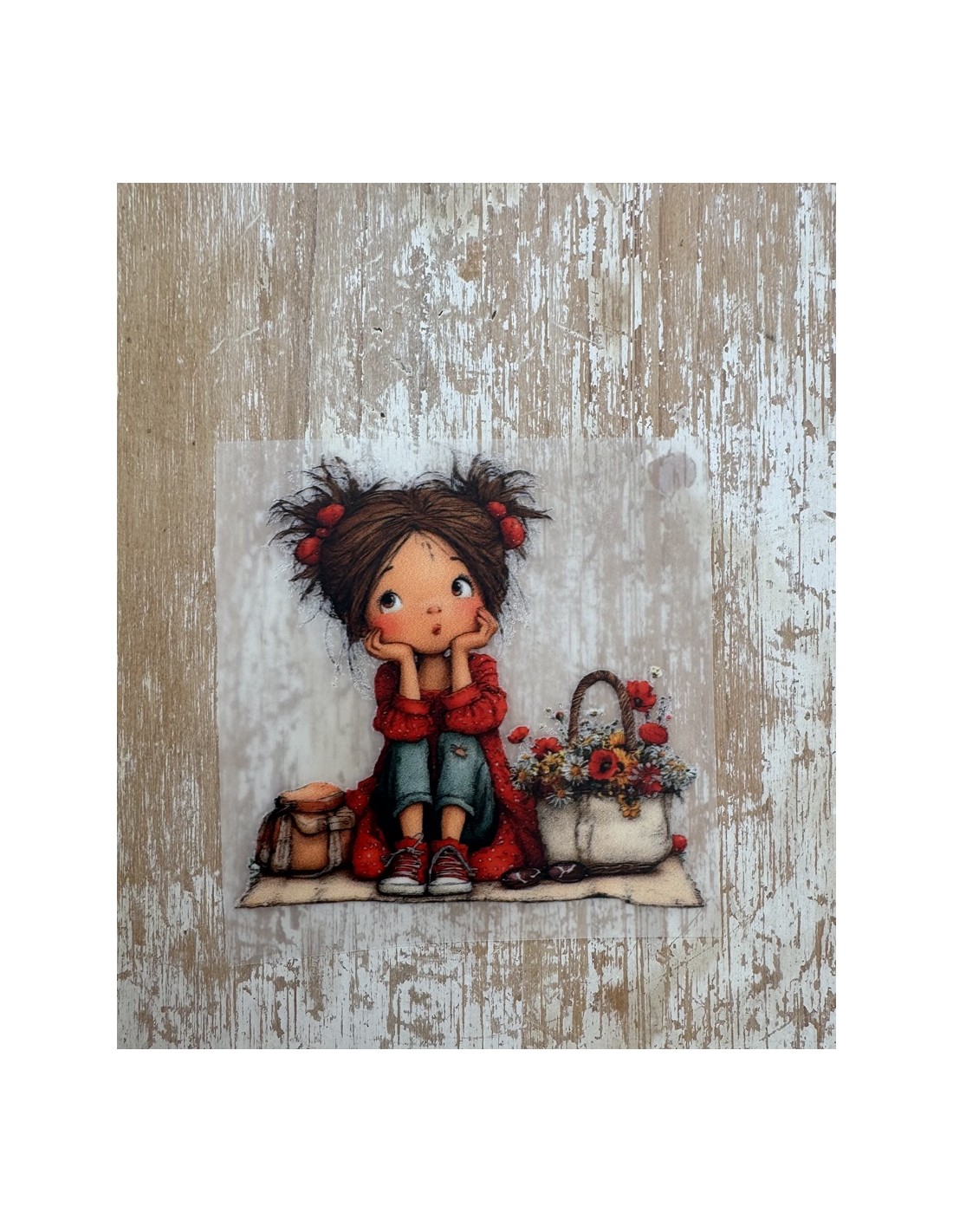 Transfer DTF de alta calidad con ilustración de niña estilo vintage sentada junto a un bolso floral.