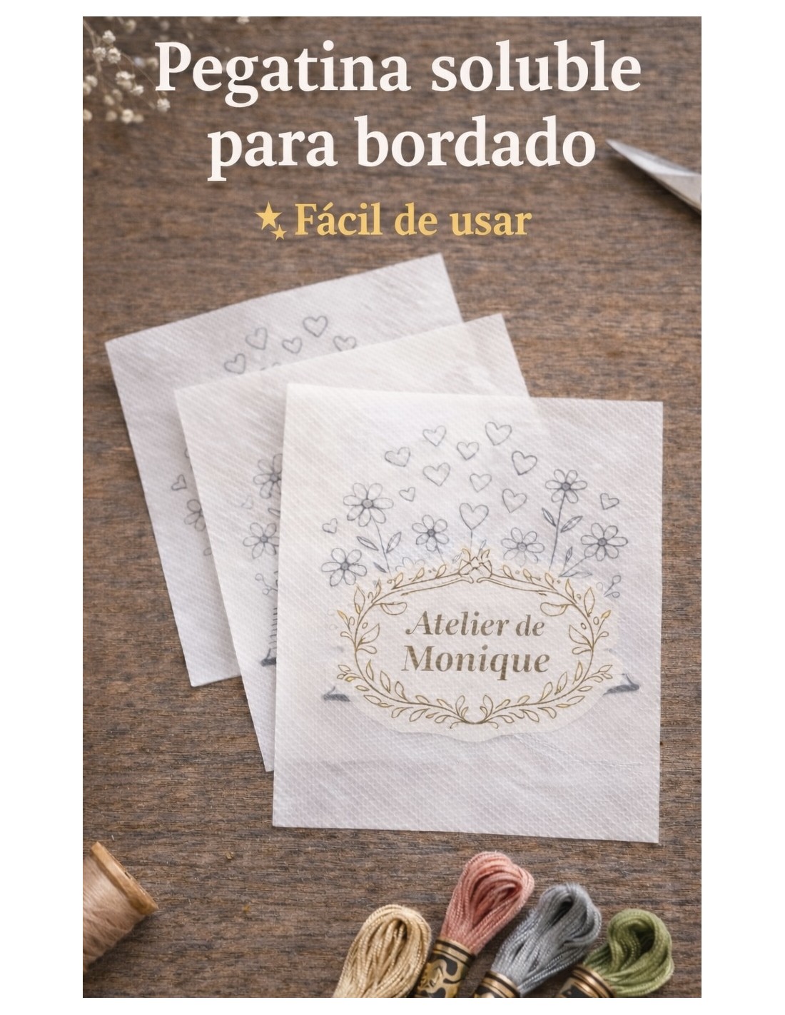 Solo tienes que pegarla sobre la tela, bordar siguiendo el diseño y, al terminar, mojarla en agua para que desaparezca