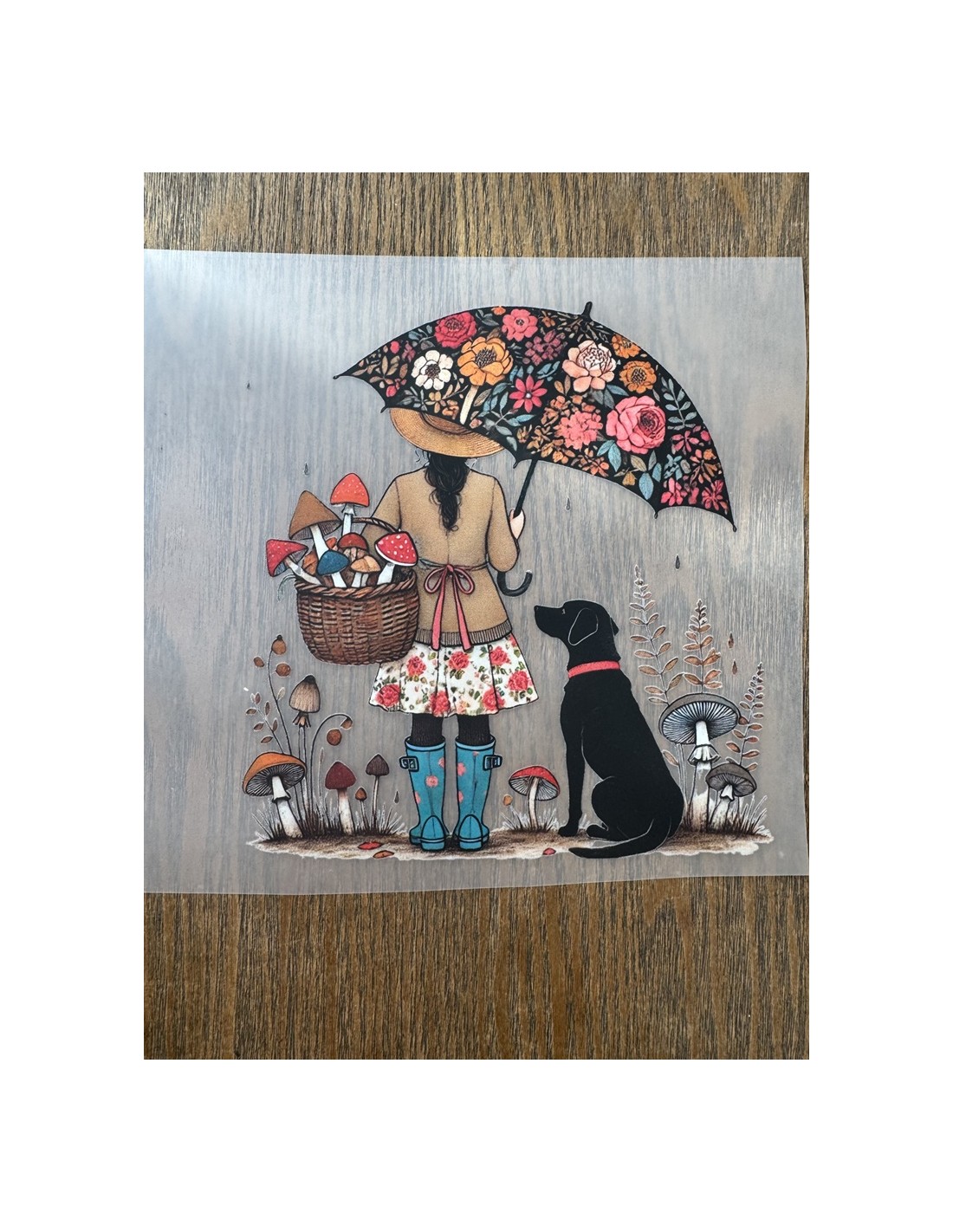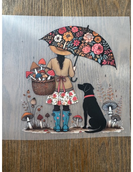 La escena muestra a una mujer con su sombrero y paraguas de flores, acompañada de su perro fiel y una cesta repleta de setas. Los tonos cálidos y el detalle artesanal transmiten serenidad y amor por la naturaleza.