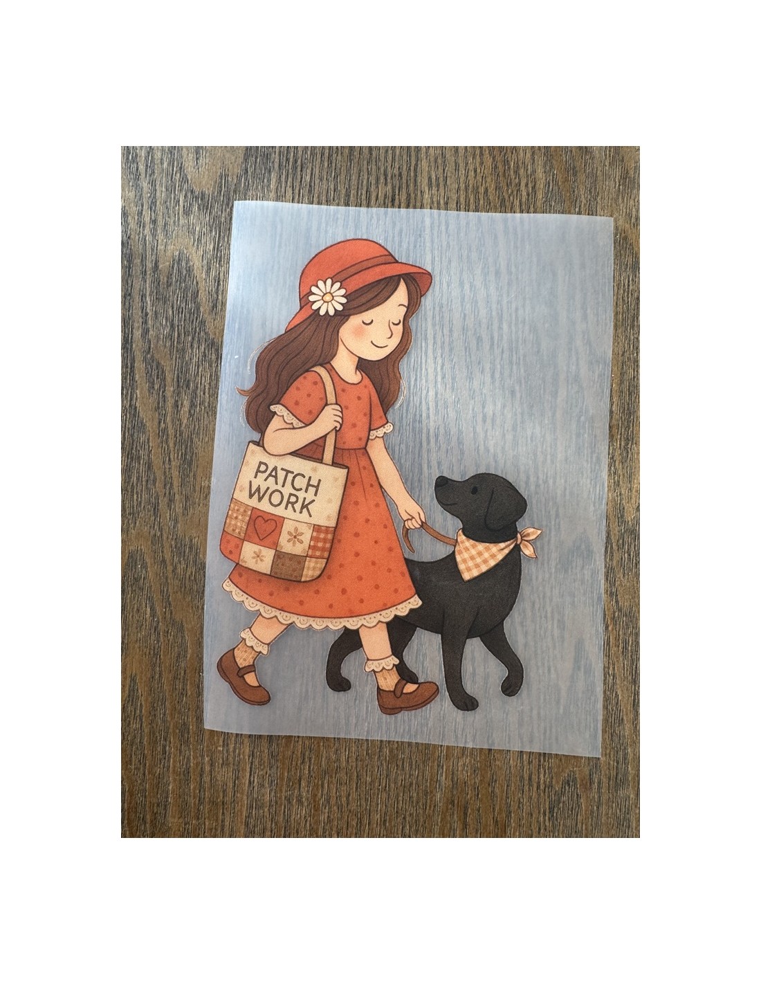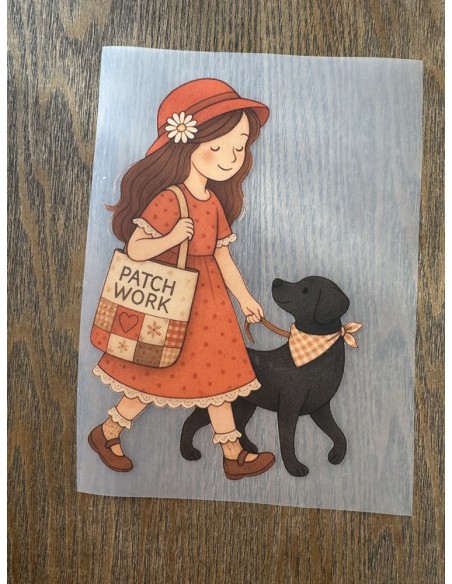 La chica, con su vestido y sombrero en tonos cálidos, camina junto a su perro fiel llevando su bolsa de patchwork, símbolo del amor por lo hecho a mano y la calma de crear con el corazón.