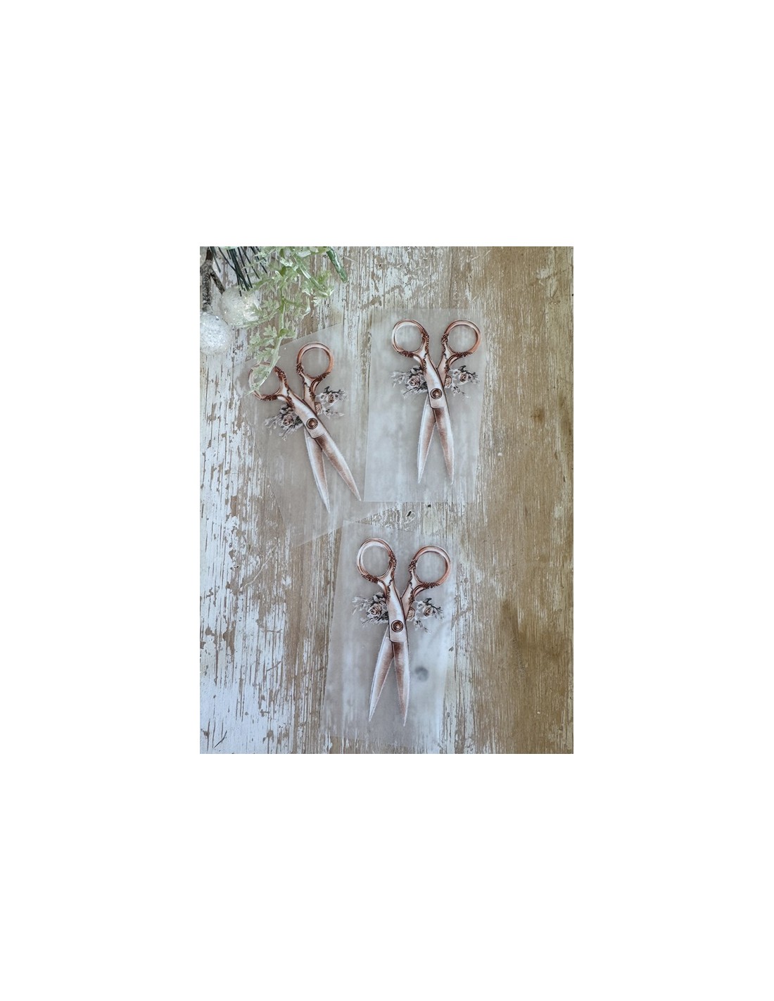 Transfer de aproximadamente 7 x 7 cm (medida orientativa), con unas elegantes tijeras vintage adornadas con pequeñas flores en tonos empolvados.