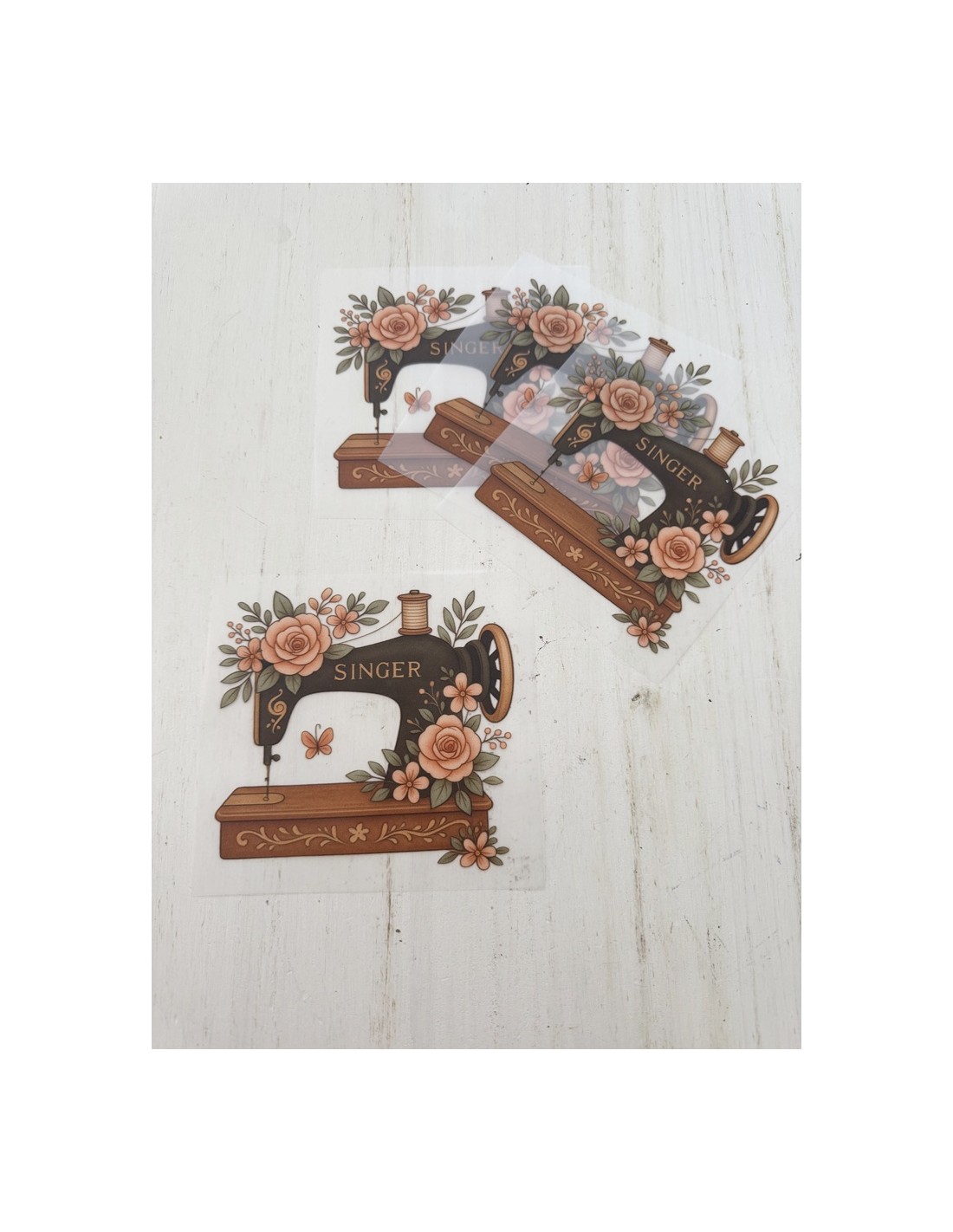 Transfer textil DTF con ilustración de máquina de coser estilo vintage decorada con flores, ideal para personalizar prendas y proyectos creativos.