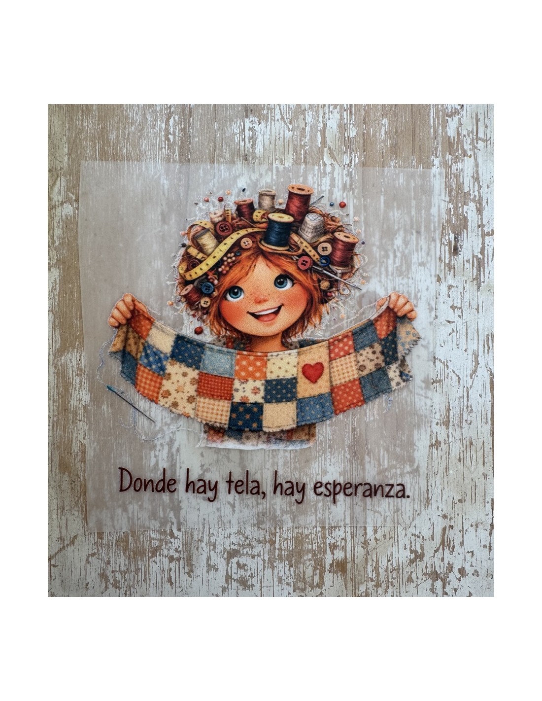 Transfer DTF de alta calidad con ilustración de muñequita costurera sosteniendo una pieza de patchwork y la frase:
