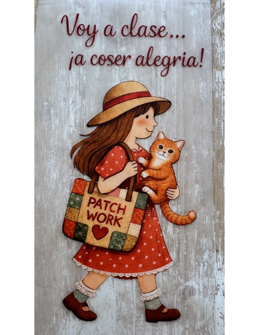 Una escena llena de ternura: camino a clase, con ilusión, telas bonitas… y un pequeño compañero que lo hace todo aún más especial