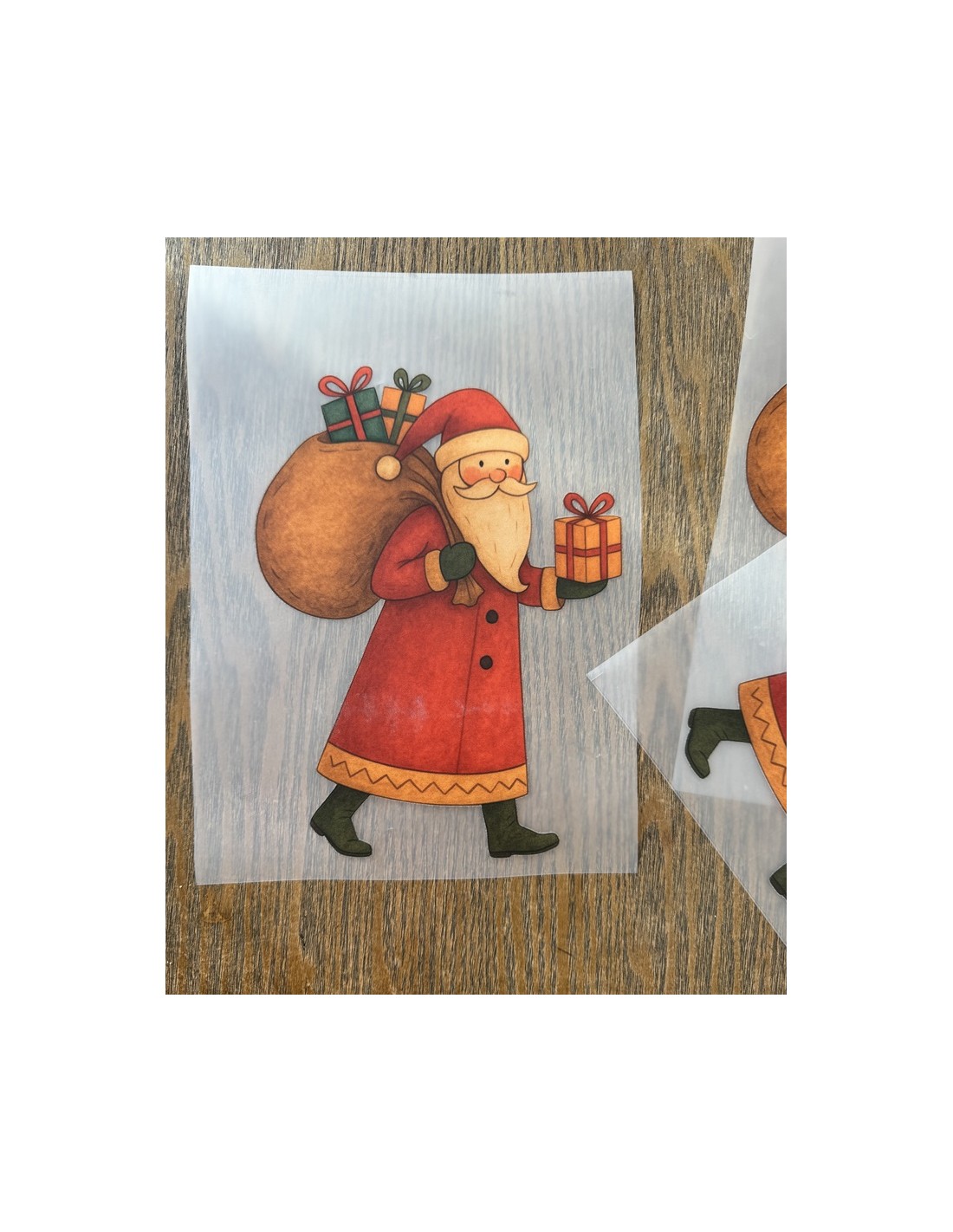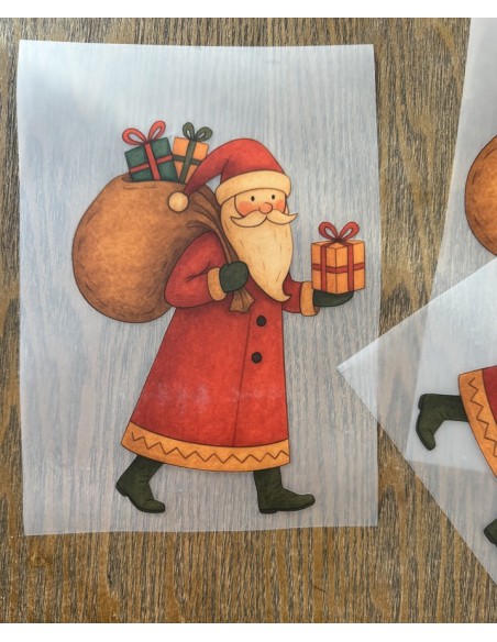 Papá Noel camina con su saco de regalos rebosante de sorpresas, llevando en sus manos un presente envuelto con cariño. Sus colores cálidos y su estilo artesanal evocan la magia de las Navidades de siempre.