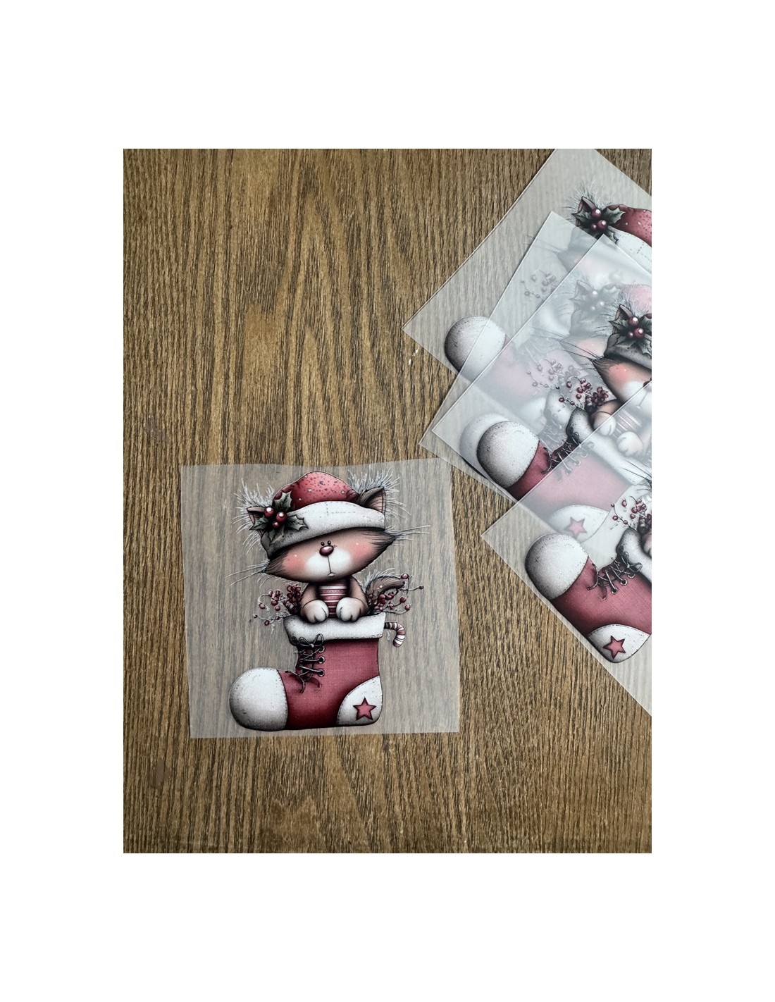 Transfer de alta calidad con un adorable gatito dentro de una bota navideña, perfecto para personalizar camisetas, bolsas, neceseres y proyectos DIY. Ideal para manualidades de Navidad y ropa infantil.
