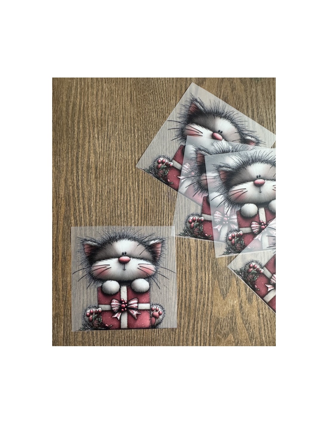 Transfer navideño de alta calidad con un adorable gatito abrazando un regalo rojo, ideal para personalizar camisetas, bolsas, neceseres y proyectos DIY. Perfecto para manualidades de Navidad y ropa infantil.
