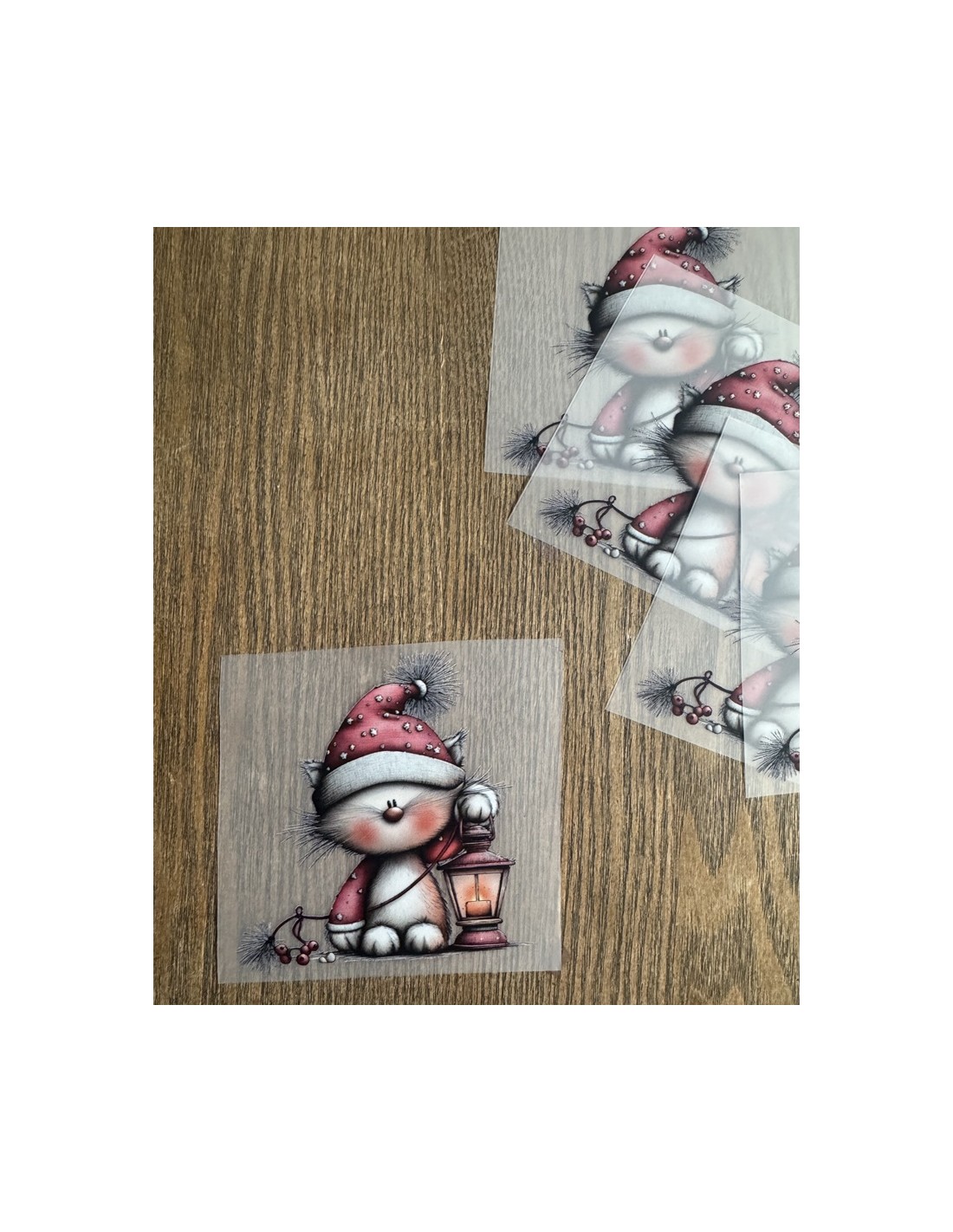 Transfer navideño de alta calidad con un adorable gatito sosteniendo un farolillo, ideal para personalizar camisetas, neceseres, bolsas y proyectos DIY. Perfecto para manualidades de Navidad y ropa infantil.