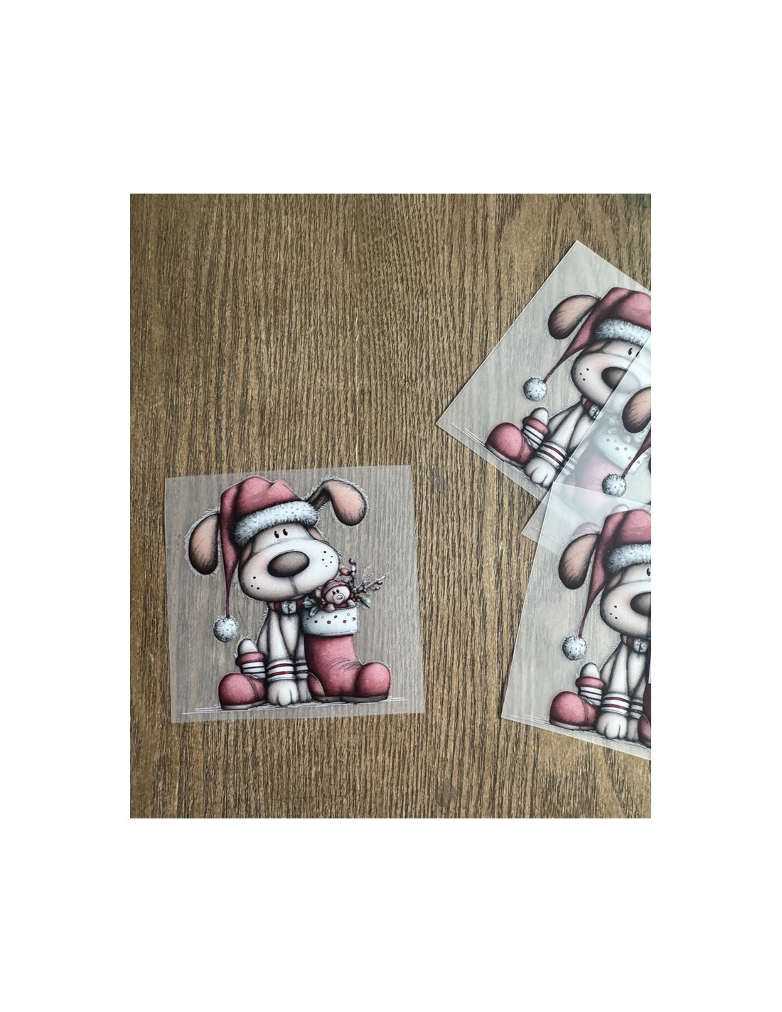 Transfer de alta calidad con un adorable perrito con gorrito de Navidad y calcetín rojo, perfecto para personalizar camisetas, bolsas, neceseres y proyectos DIY. Ideal para manualidades de Navidad y ropa infantil.