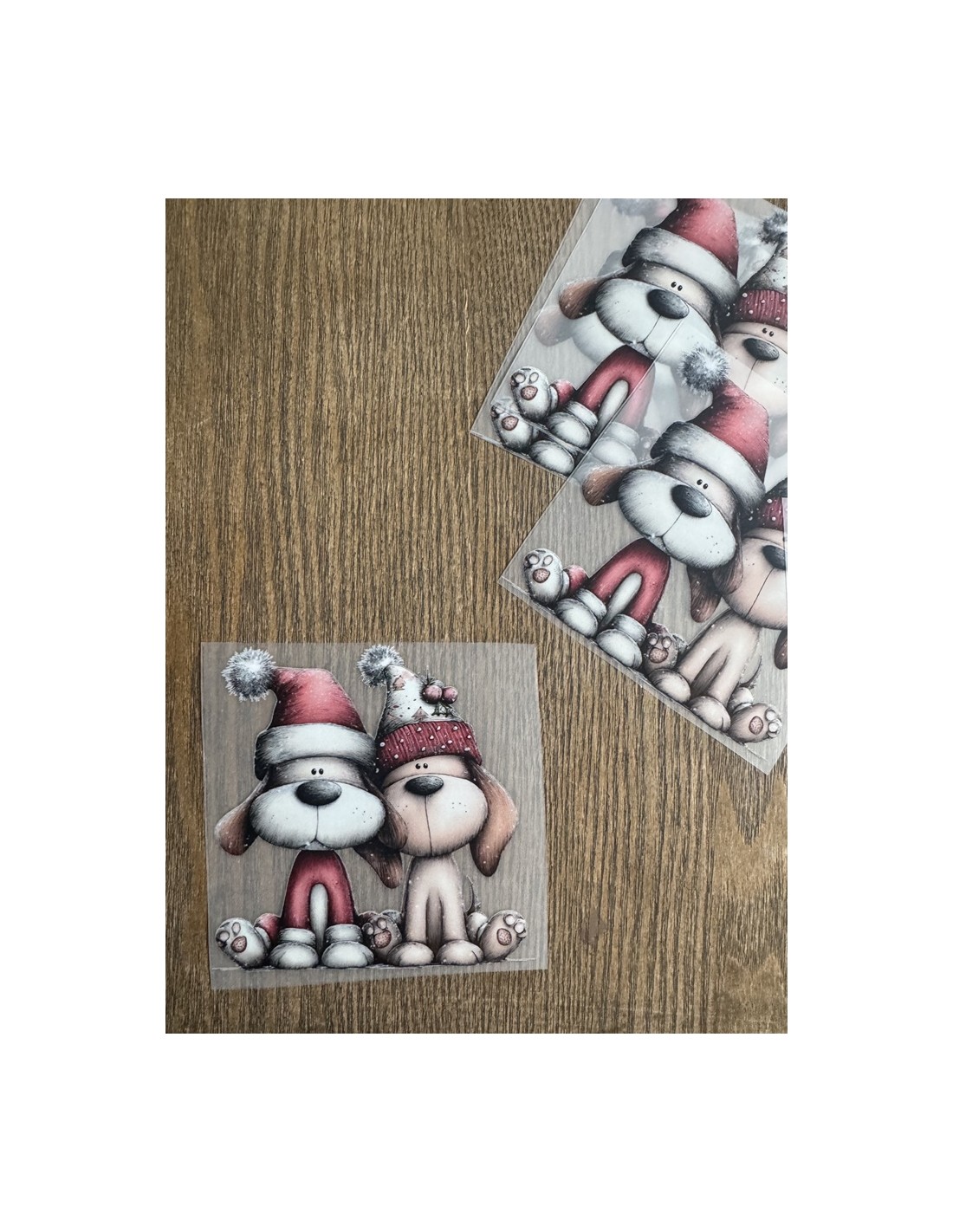 Transfer de alta calidad con una adorable pareja de perritos con gorritos de Navidad, perfecto para decorar camisetas, bolsas, neceseres y proyectos DIY. Ideal para manualidades navideñas y ropa infantil.