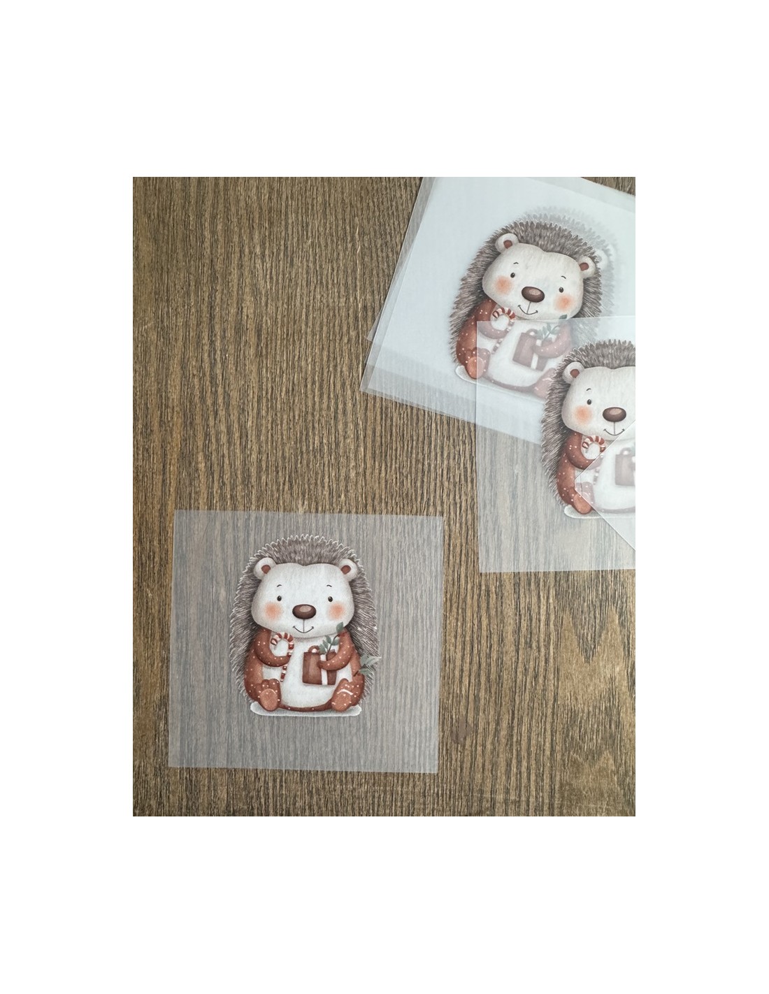 Transfer de alta calidad con un adorable erizo sosteniendo un regalo y un bastón de caramelo, perfecto para personalizar camisetas, neceseres, bolsas y proyectos DIY. Ideal para manualidades de Navidad y ropa infantil.