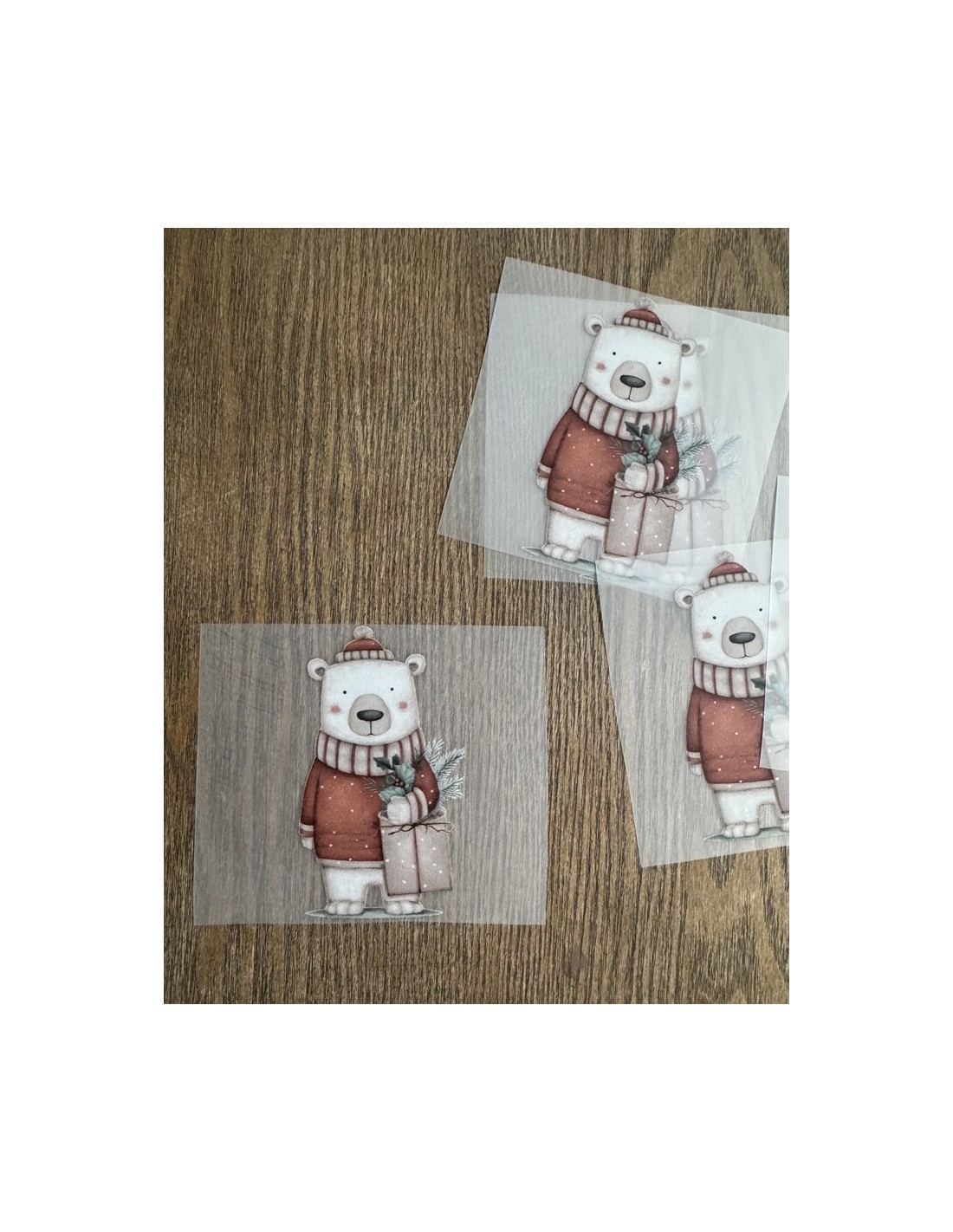 Transfer de alta calidad con un adorable osito polar con jersey rojo y regalo, ideal para personalizar camisetas, bolsas, neceseres y proyectos DIY. Perfecto para ropa infantil y manualidades de Navidad.