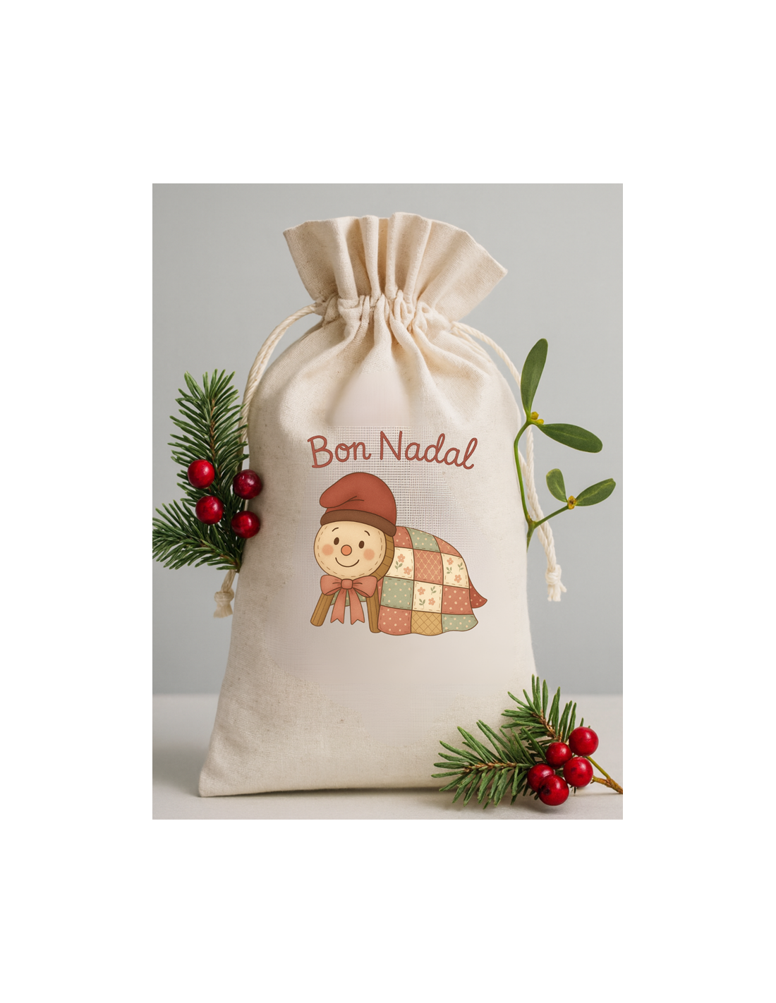 Transfer navideño de alta calidad con un adorable Tió de Nadal en estilo patchwork, ideal para decorar bolsas, camisetas, saquitos, neceseres y proyectos DIY. Perfecto para manualidades infantiles, regalos personalizados y decoración de Navidad en catalán.