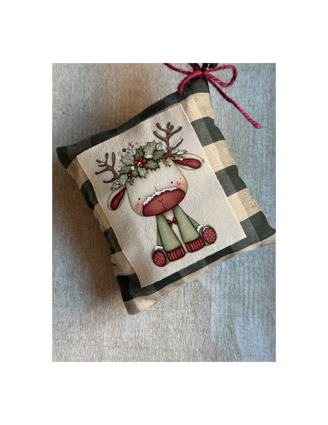 Transfer navideño de aproximadamente 7 x 7 cm, con un dulce renito sentado y una preciosa corona de hojas, acebo y detalles invernales. Ideal para decorar cojincitos, adornos para el árbol, etiquetas navideñas o cualquier proyecto de patchwork con un toque tierno y cálido.
