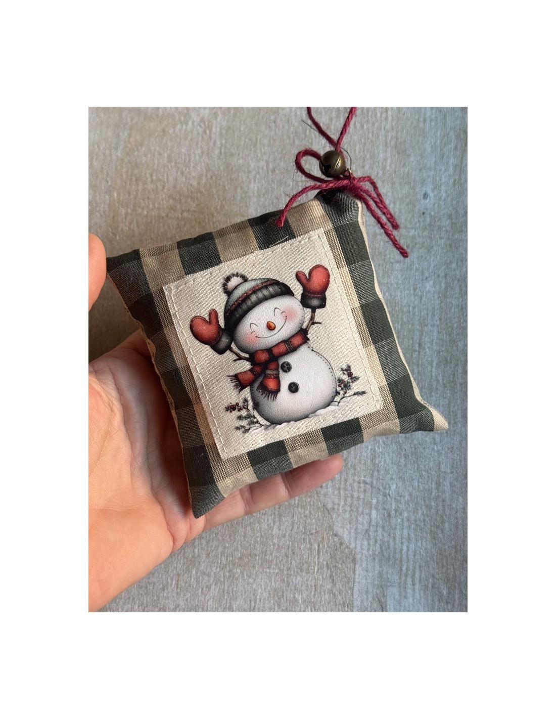 Transfer navideño de aproximadamente 7 x 7 cm, con un adorable muñeco de nieve levantando los brazos con guantes rojos, gorrito invernal y bufanda a juego. Un diseño dulce, cálido y muy navideño, ideal para adornos del árbol, cojincitos decorativos, etiquetas de regalo o proyectos de patchwork.