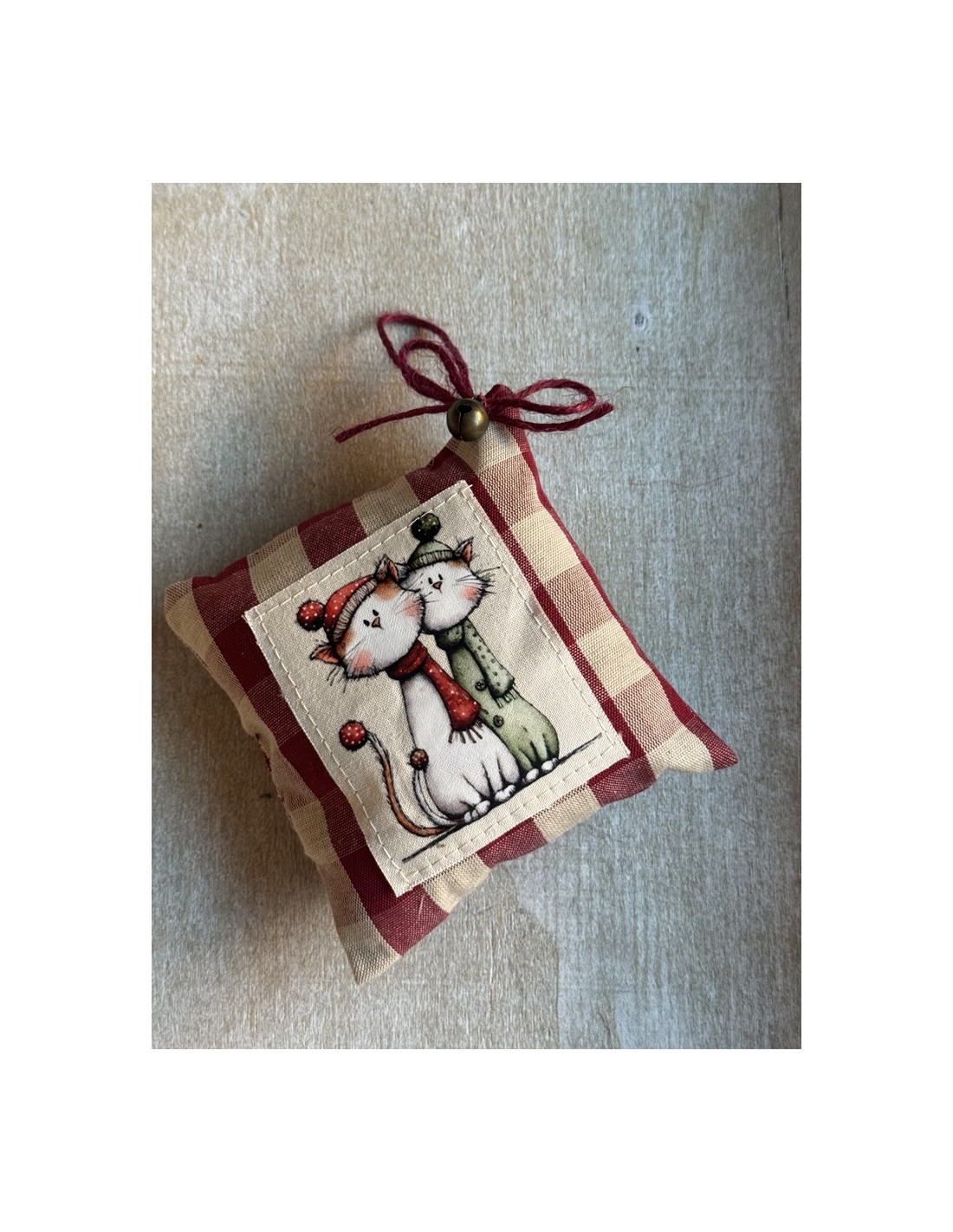 Transfer navideño de aproximadamente 7 x 7 cm, con dos adorables gatitos acurrucados, vestidos con gorritos y bufandas de invierno. Un diseño dulce y entrañable, perfecto para proyectos de patchwork, cojincitos decorativos, adornos del árbol o etiquetas navideñas con un toque cálido y romántico.