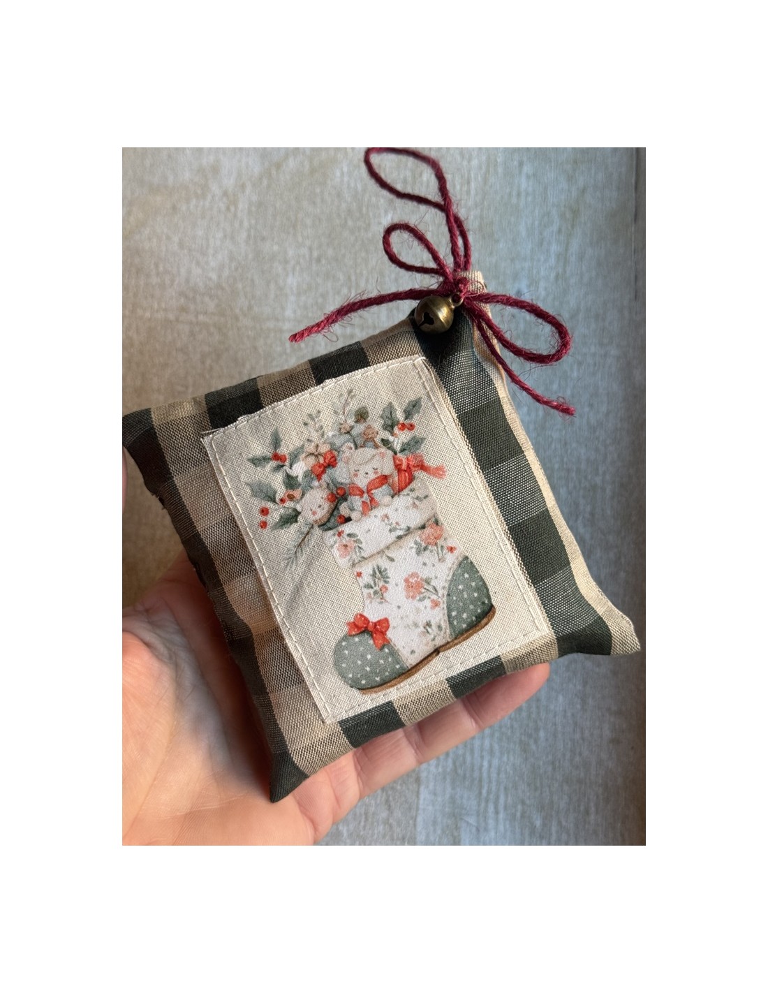 Transfer navideño de aproximadamente 7 x 7 cm, con una preciosa bota navideña decorada en tonos verdes y florales, repleta de ramitas, bayas y lacitos rojos. Un diseño delicado, elegante y muy especial, ideal para cojincitos decorativos, adornos del árbol, etiquetas navideñas y proyectos de patchwork con un toque romántico.