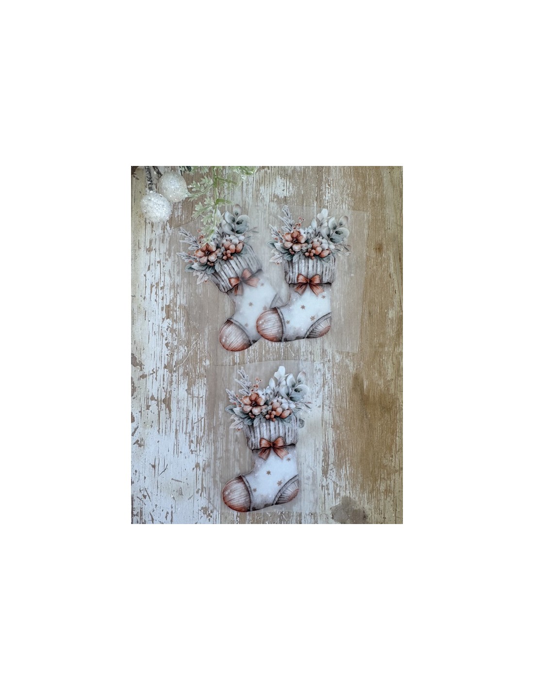 Transfer navideño de aproximadamente 7 x 7 cm (medida orientativa según diseño), con una preciosa bota invernal decorada con motivos suaves, estrellas doradas y un bouquet de flores, hojas y bayas en tonos delicados.