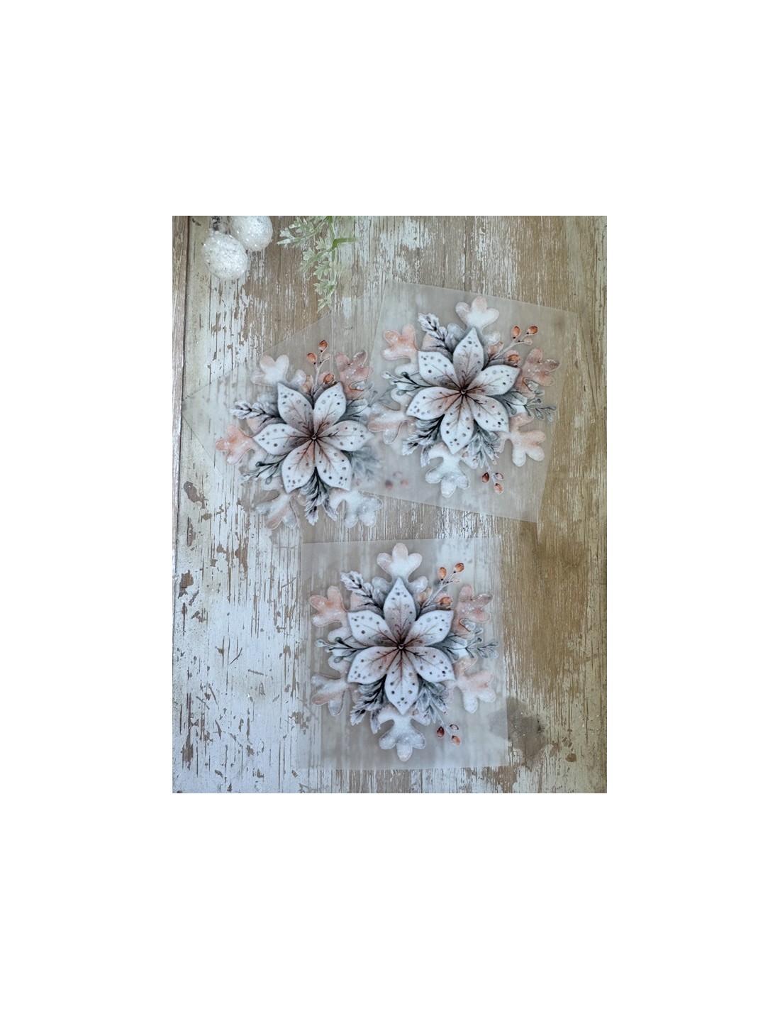 Transfer navideño de aproximadamente 7 x 7 cm (medida orientativa), con una preciosa estrella floral compuesta por pétalos nevados, hojas heladas y pequeños toques en tonos rosados y grisáceos.