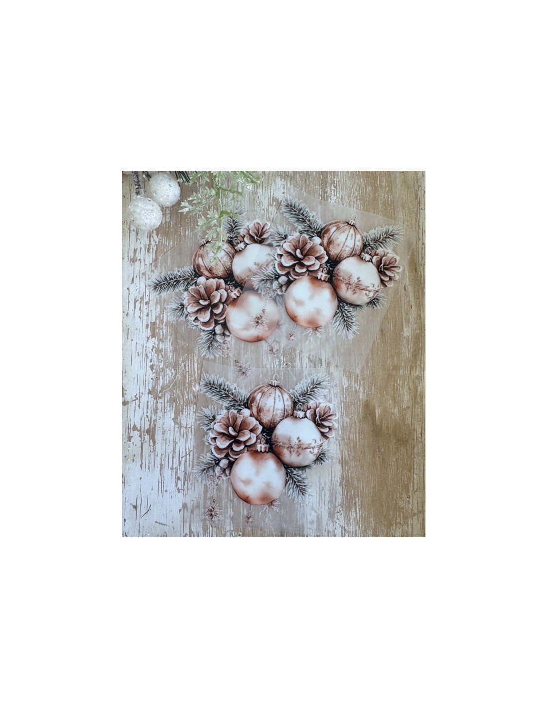 Transfer navideño de aproximadamente 7 x 7 cm (medida orientativa), con un precioso ramillete invernal formado por bolas navideñas en tonos suaves, piñas nevadas y ramas de abeto.
